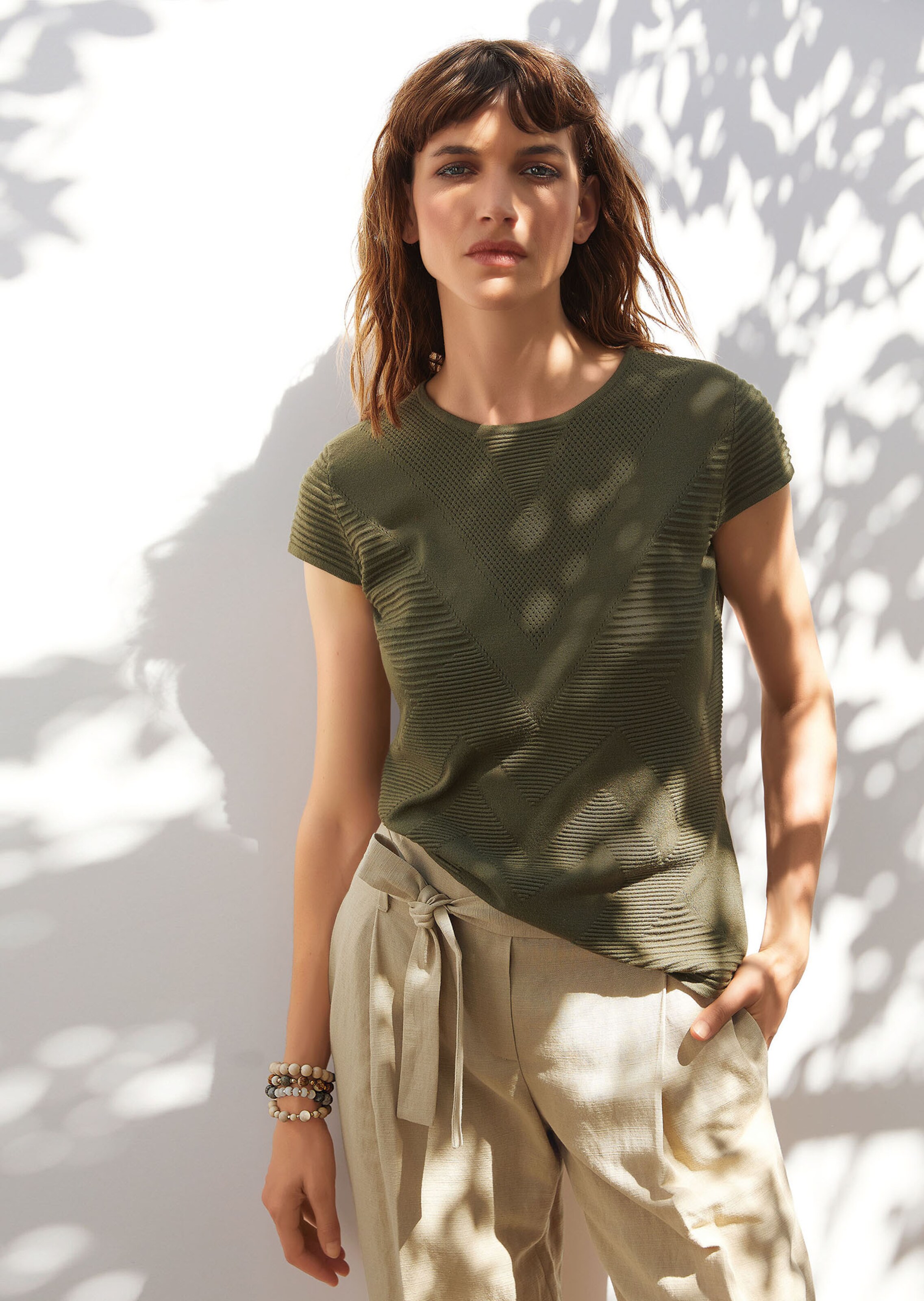 In combination of smooth and rib textures with waist-accentuating design, featuring round neckline and cap sleeves.