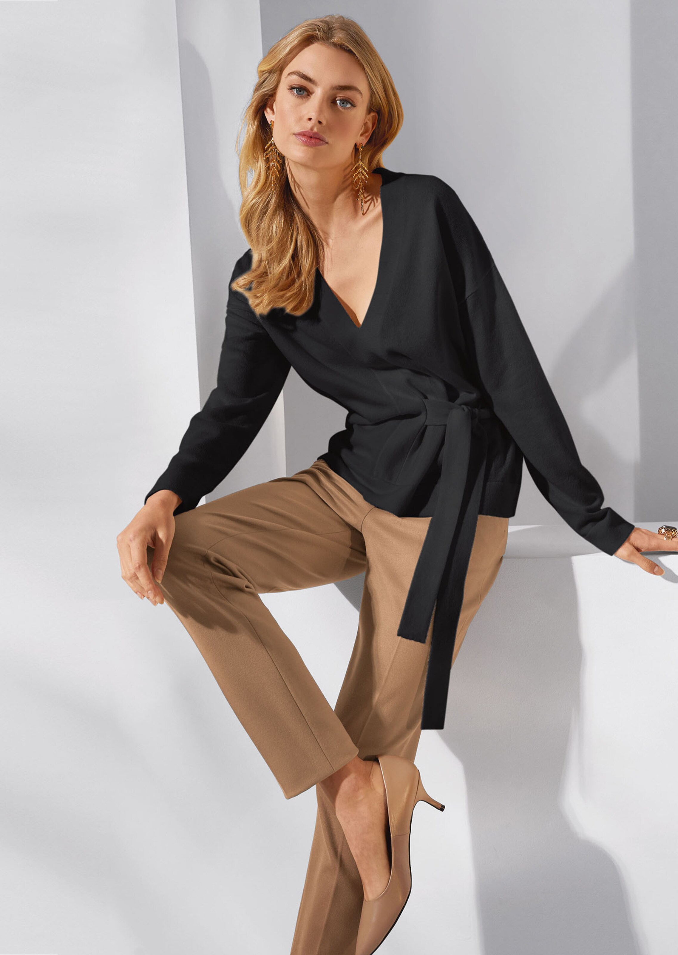 In soft and fluffy blend of Merino wool and cashmere. Casual shape with generous V-neck, dropped shoulders and long sleeves. Fixed tie band front and back. Tubular edges.