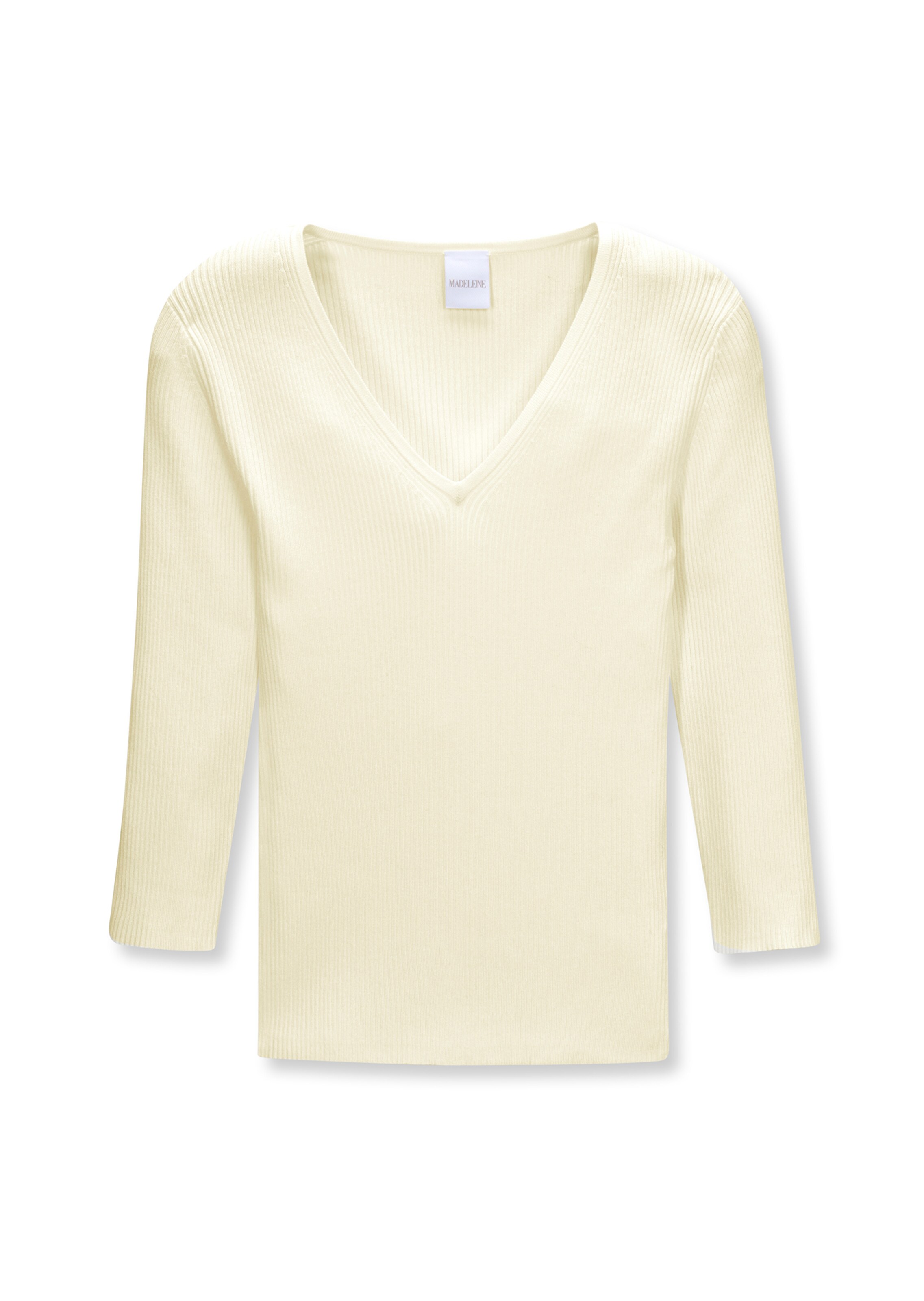 Soft, shape-retaining ribbed knit. Tailored, slim-cut jumper with 3/4-length sleeves and V-neckline.
