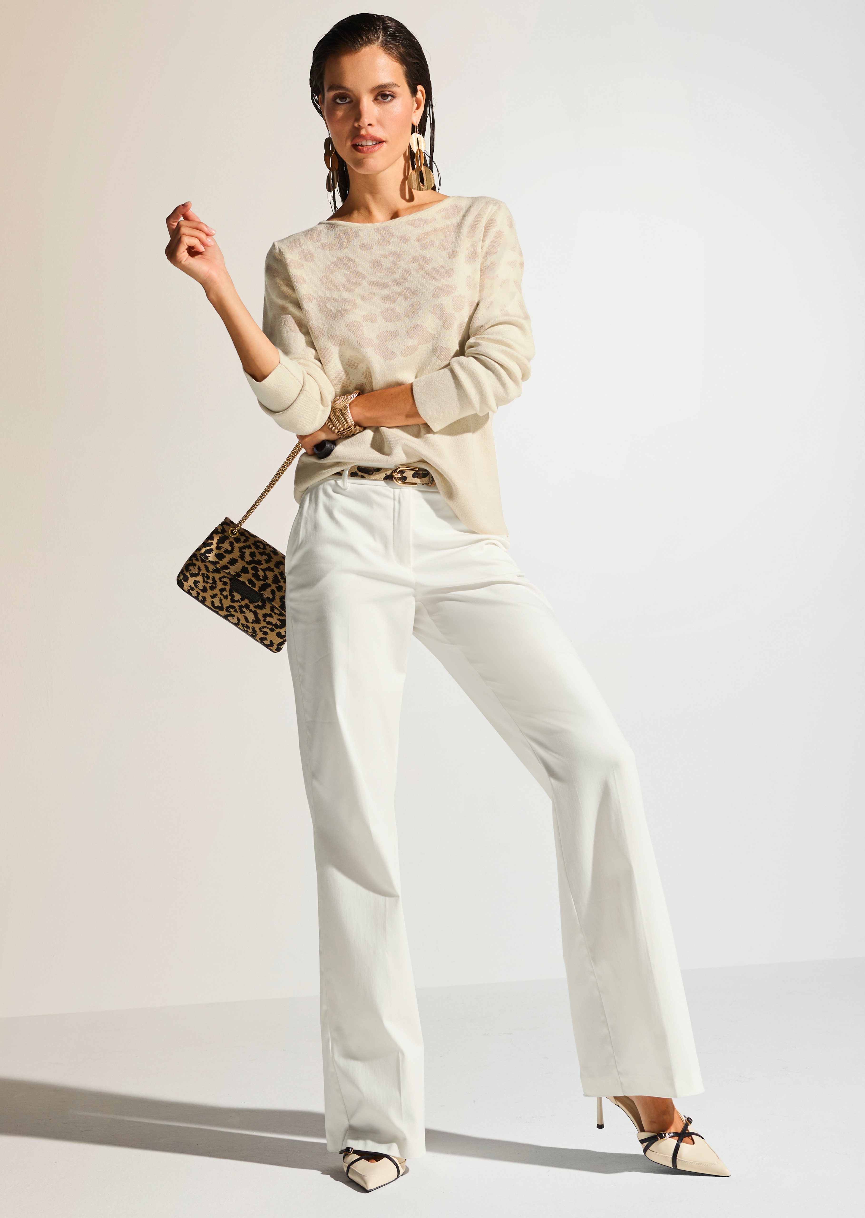Instead of flashy and wild, the popular leopard pattern is presented here as a subtle tone-on-tone jacquard with fine novelty yarns, a boat neckline and long sleeves.