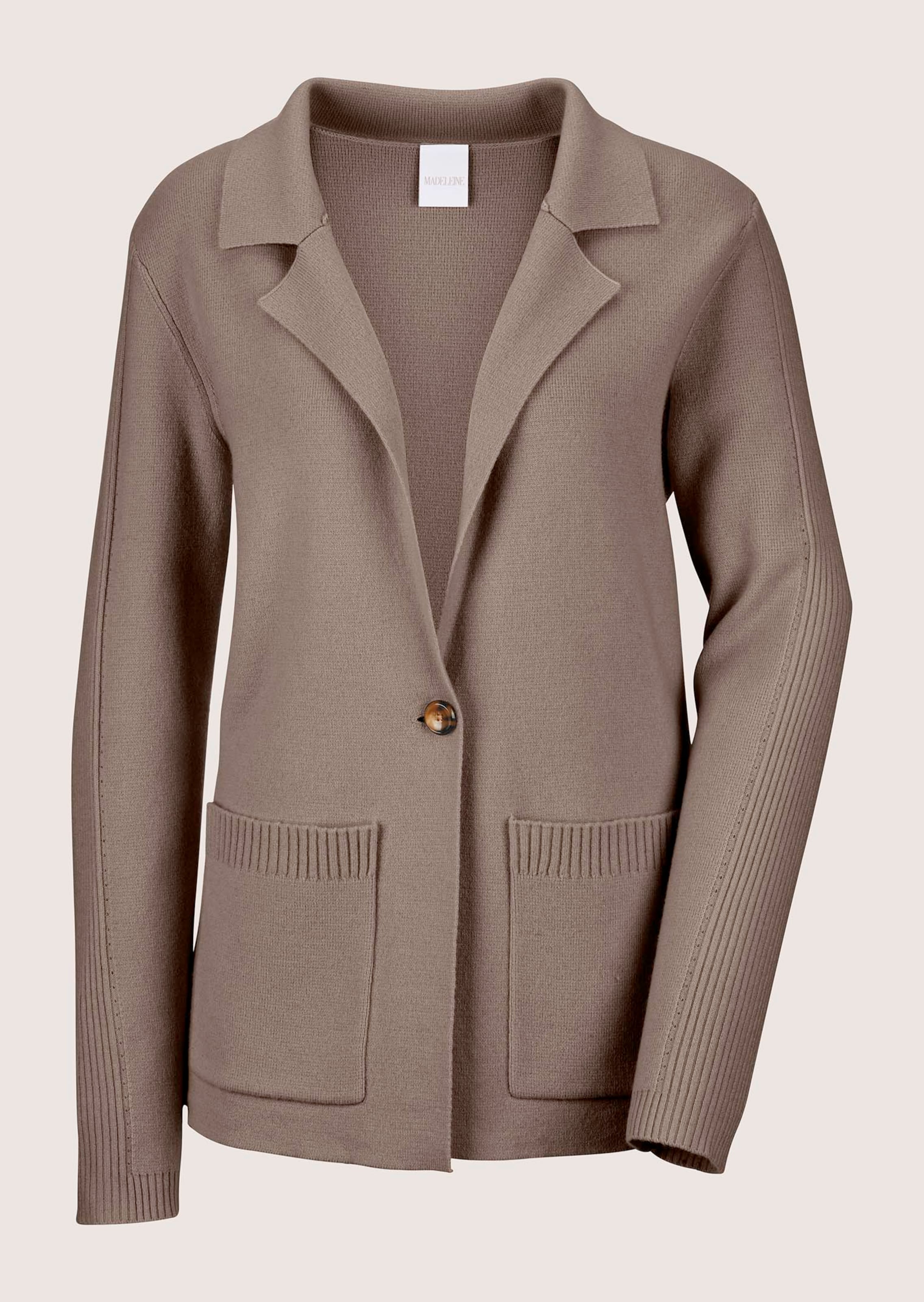 Elegant yarn mix with Good Cashmere content for ultimate comfort. Top quality craftmanship with a long lapel collar, patch pockets and long sleeves. Fastens with a single button. Sleeves with an elegant pointelle pattern. Shape-retaining ribbed trims on the sleeves, hem and pockets.