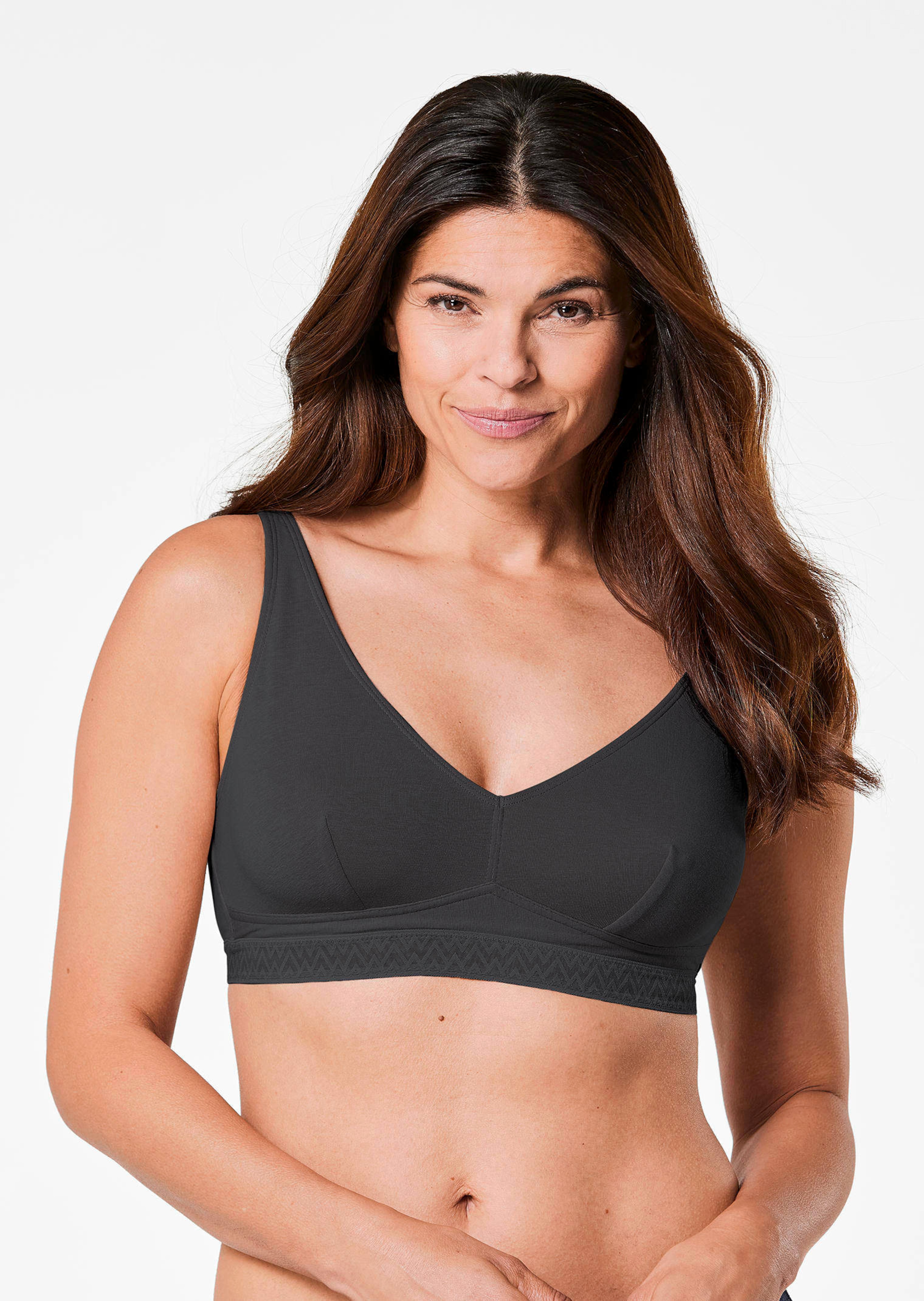 Bra without underwire from NATURANA. This soft model in a bustier shape features a chest band with decorative elasticated lace. The opaque, double-layered cups merge into the slender shoulder straps, which are adjustable at the back. Made of soft, comfortable cotton.