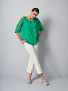 Edel und raffiniert präsentiert sich die Lagenbluse im Materialmix. Der Oberstoff ist aus weich fließendem Chiffon, der Body ist mit einem Jersey-Top unterlegt. Die halblangen Fledermausärmel verleihen im semitransparentem Look Leichtigkeit und Eleganz. In figurumspielender Passform mit Rundhalsausschnitt und breit abgesteppten Säumen bringt die Bluse dezenten Chic in Ihr Outfit. Styling-Tipp: Da die Lagenbluse etwas weiter geschnitten ist, bieten sich schmale Hosen als Kombi-Partner an – so bleiben die Proportionen erhalten!