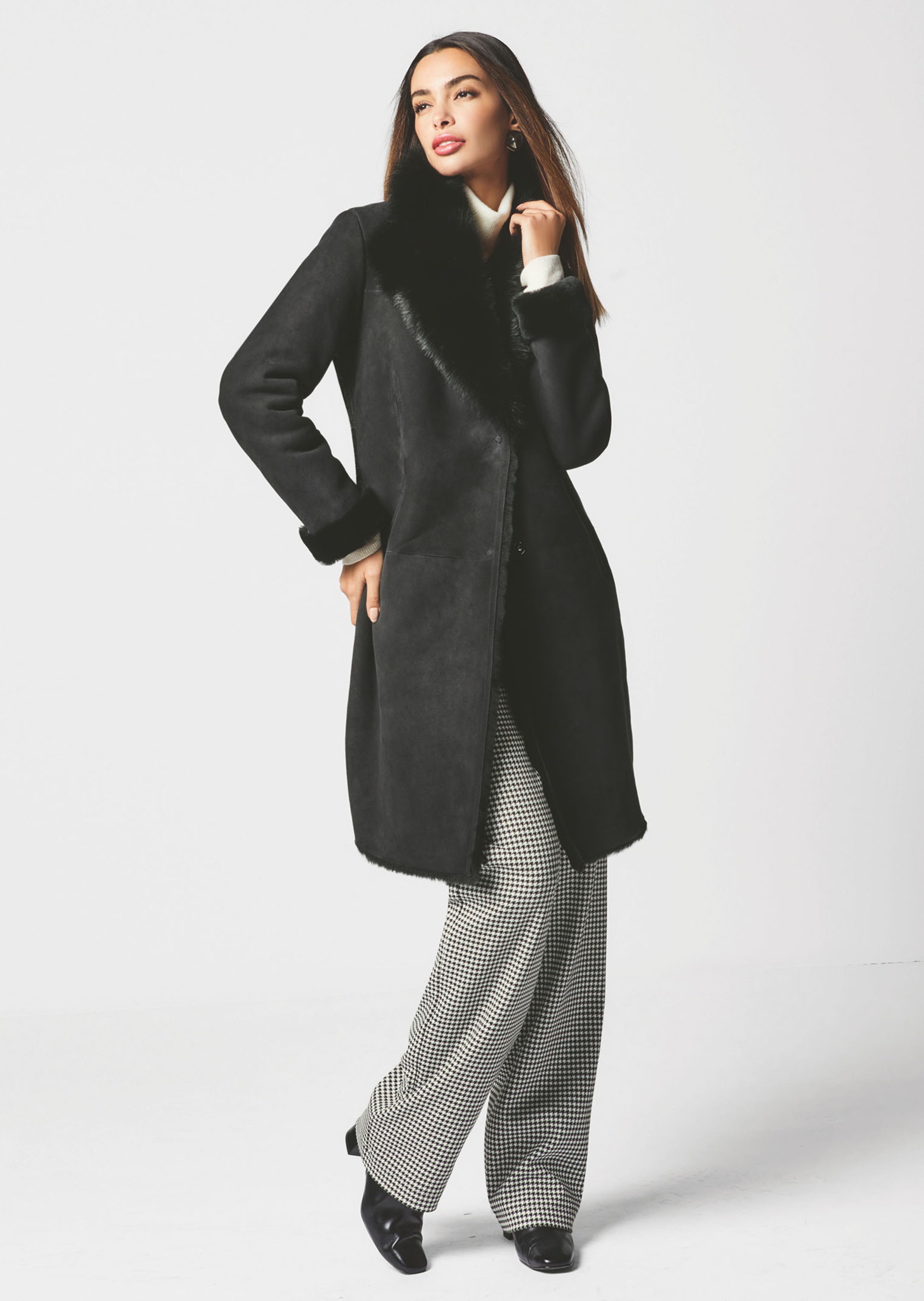 Winter luxury in a sporty mix of quilted material with snug, natural lambskin with fleece inner and suede outer. Semi-fitted, unlined jacket with fluffy, long-pile lapels, concealed snap buttons, welt pockets and long sleeves. Cosy and warm.