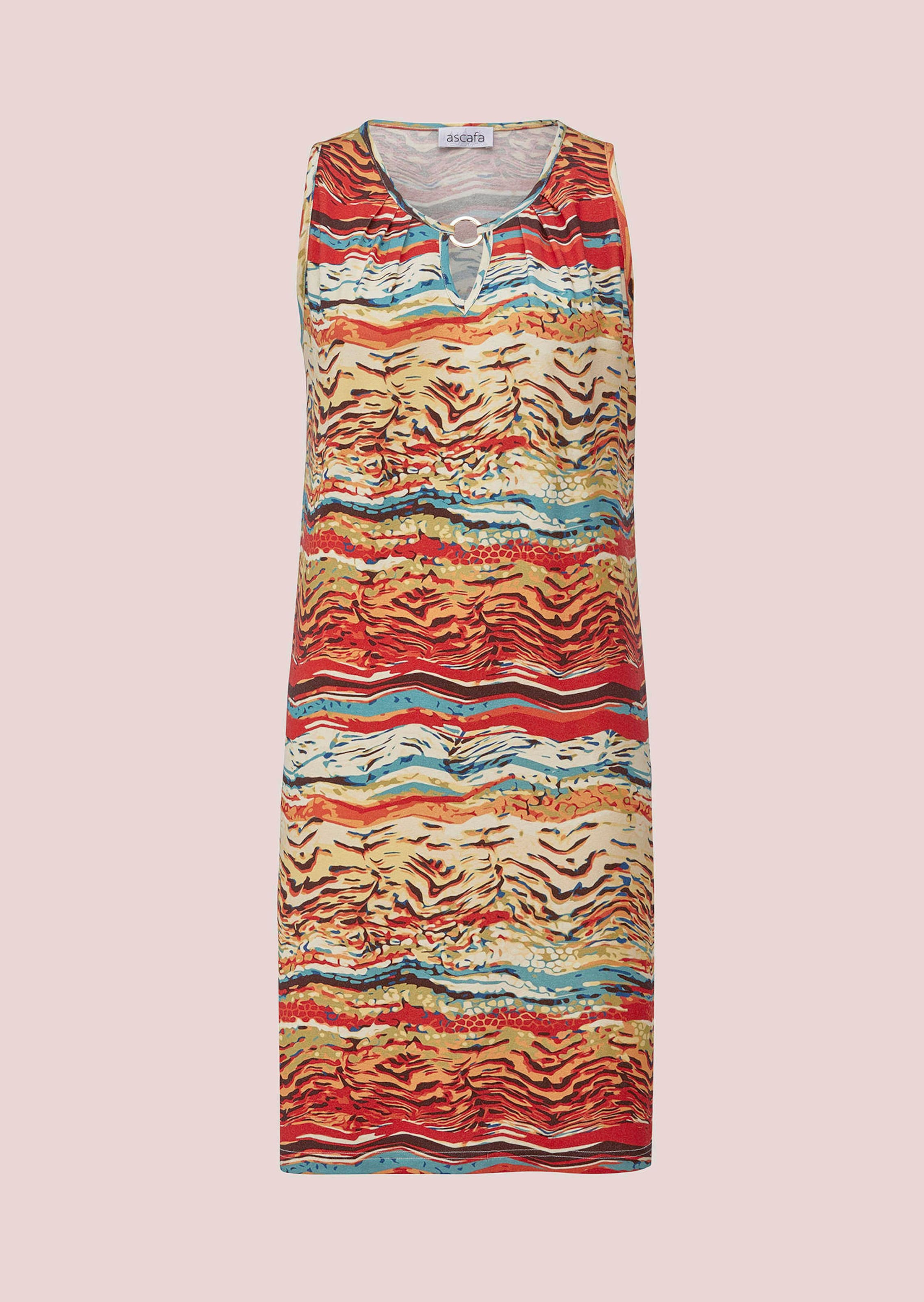 Easy to throw on and still fashionable: the sleeveless casual dress by ASCAFA stands out with its creative print that instantly adds character to any outfit. The round neckline is embellished with a ring-shaped decorative element and small pleats, while piped open shoulders add fine details. The soft viscose fabric with elastane offers shape retention and breathability – ideal for warm days at home or relaxed leisure moments on the go.