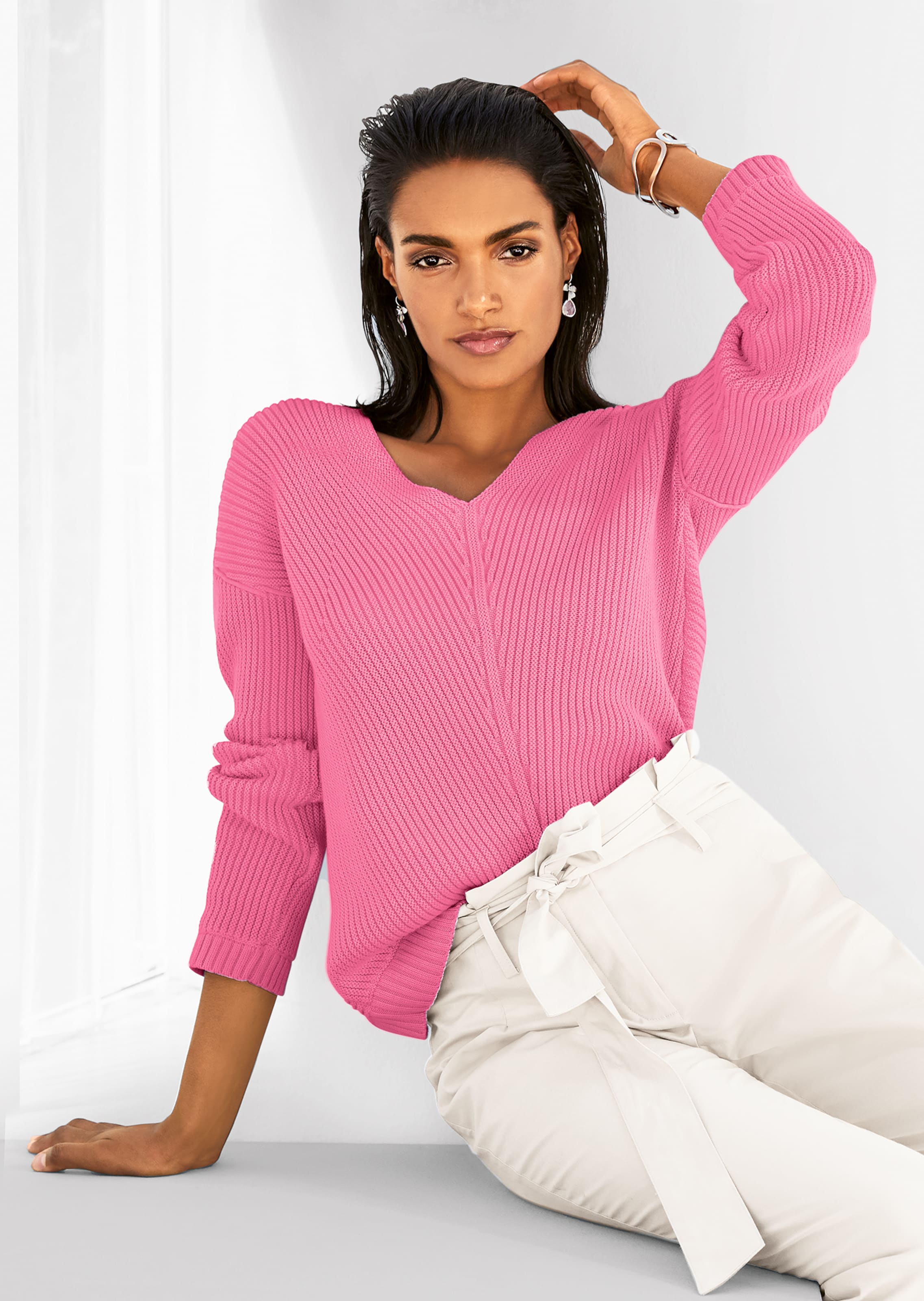 Skin-friendly natural yarn in a fashionably casual line with a V-neckline and long sleeves. Contrasting ribbed textures create an all-round modern look.