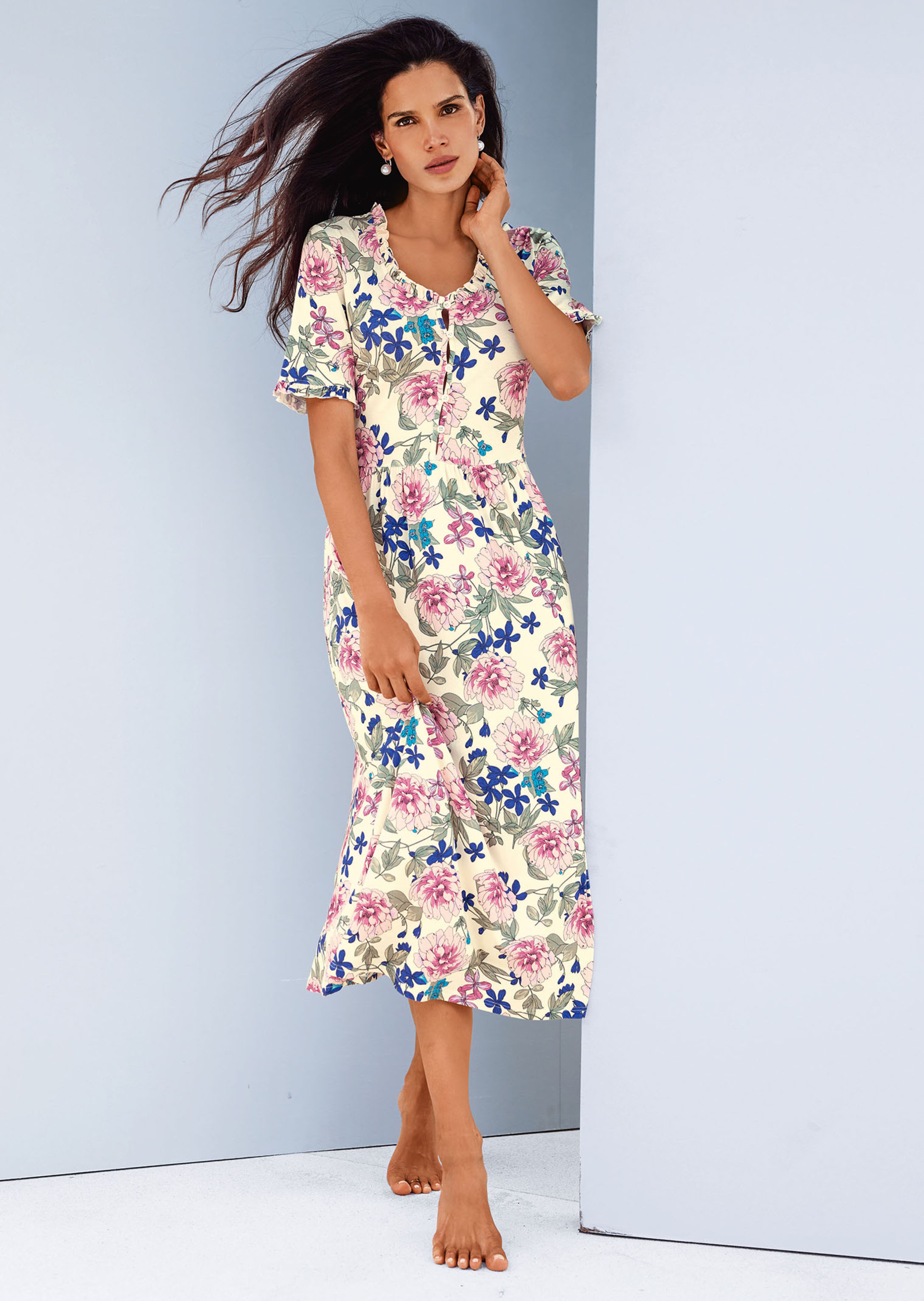 With unique floral print. Feminine romantic design, with playful ruffled ends on the décolleté and elbow-length sleeves. Loop buttoning. Frilled skirt section in graceful width.
