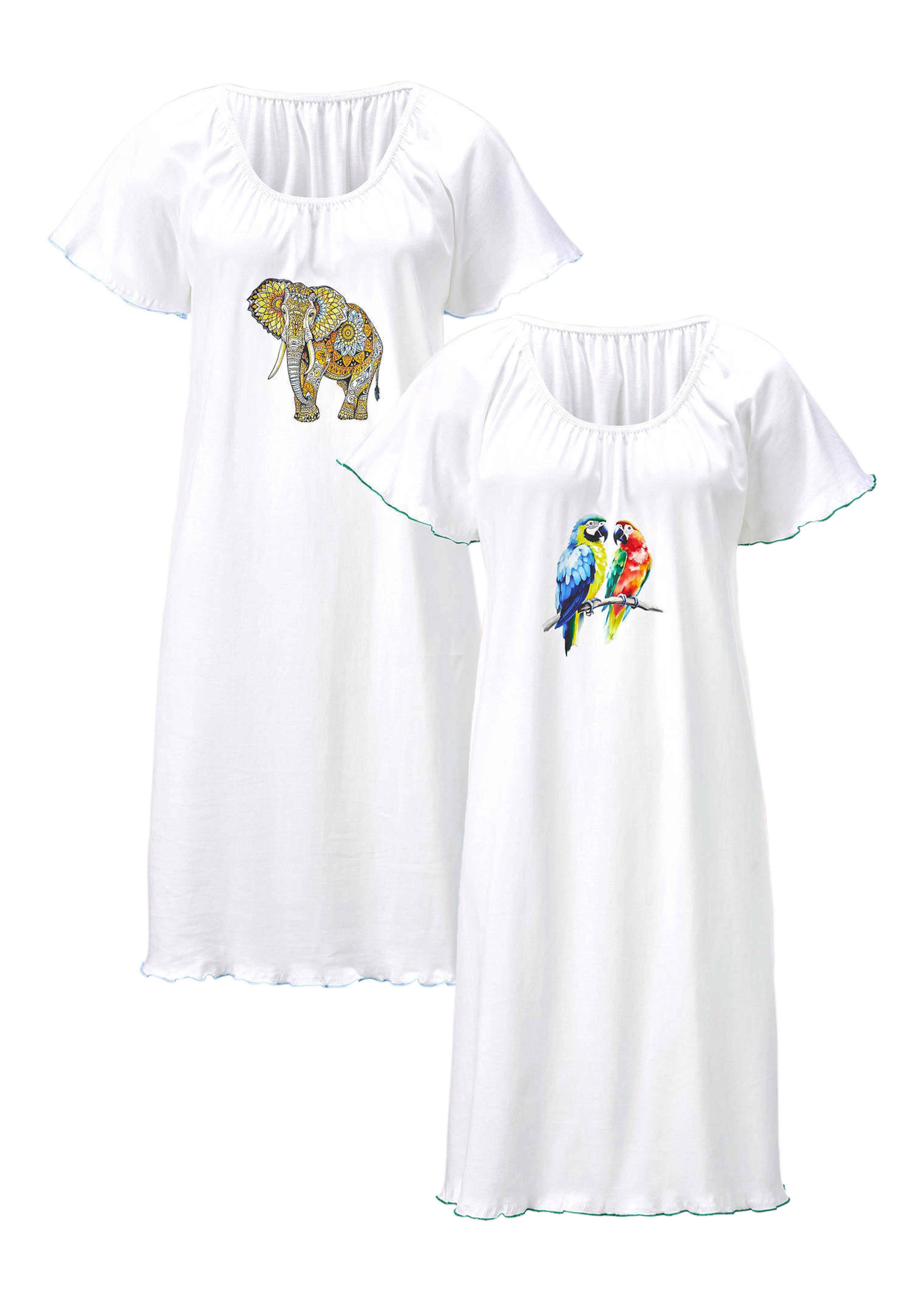 This twin pack of nightdresses in pure cotton offers lightness and comfort against the skin. The relaxed fit is enhanced by subtle gathers at the round neckline, making them easy to slip on and effortless to wear. Contrast scalloped edges on the raglan sleeves and hem add a lively touch of colour, while each piece is decorated with a playful exotic print.