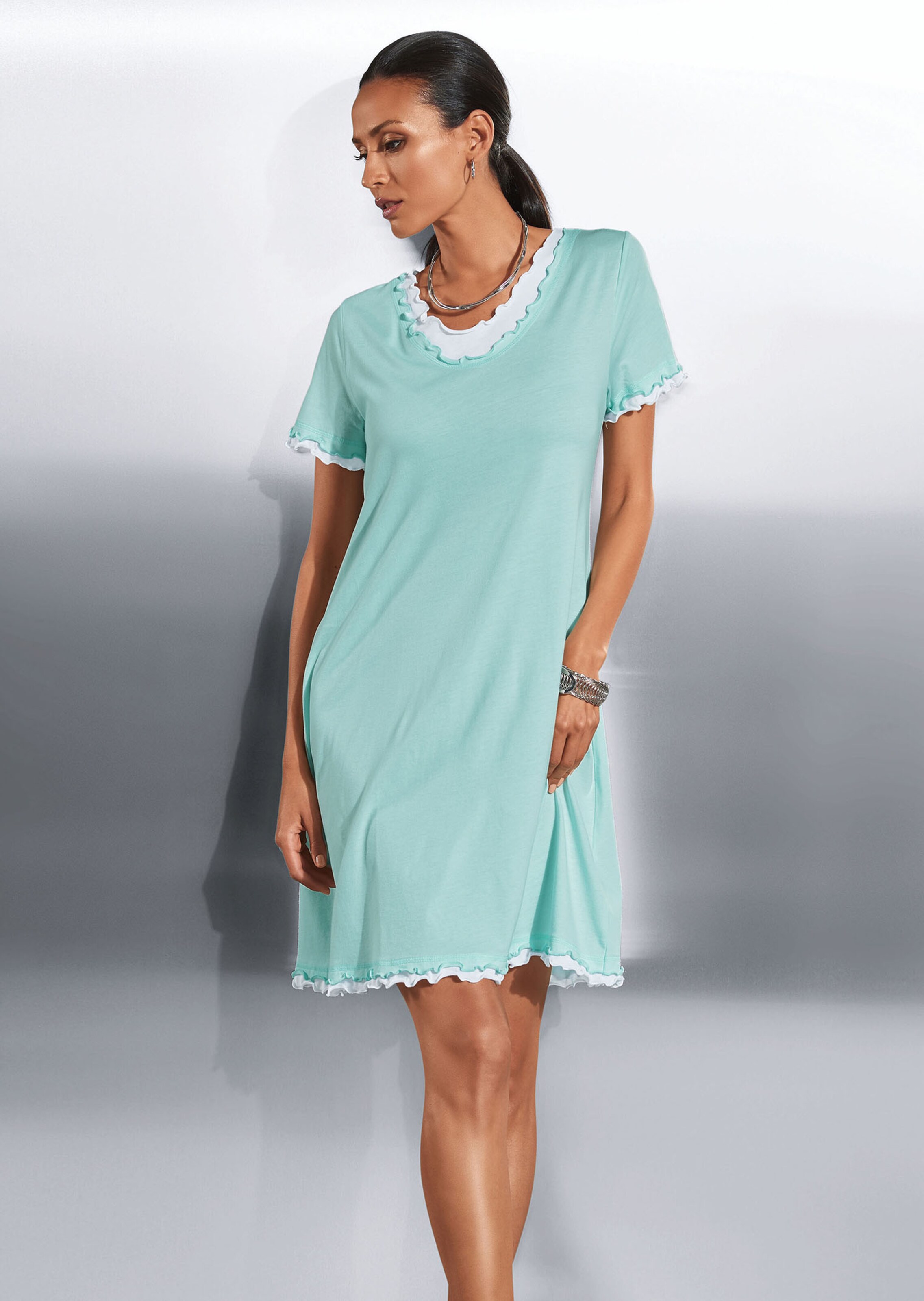 In fashionable layered appearance and slightly flared A-shape. Decorative wavy hem along neckline, short sleeves and edges of the hem. With sustainably produced TENCEL™ modal fibres.