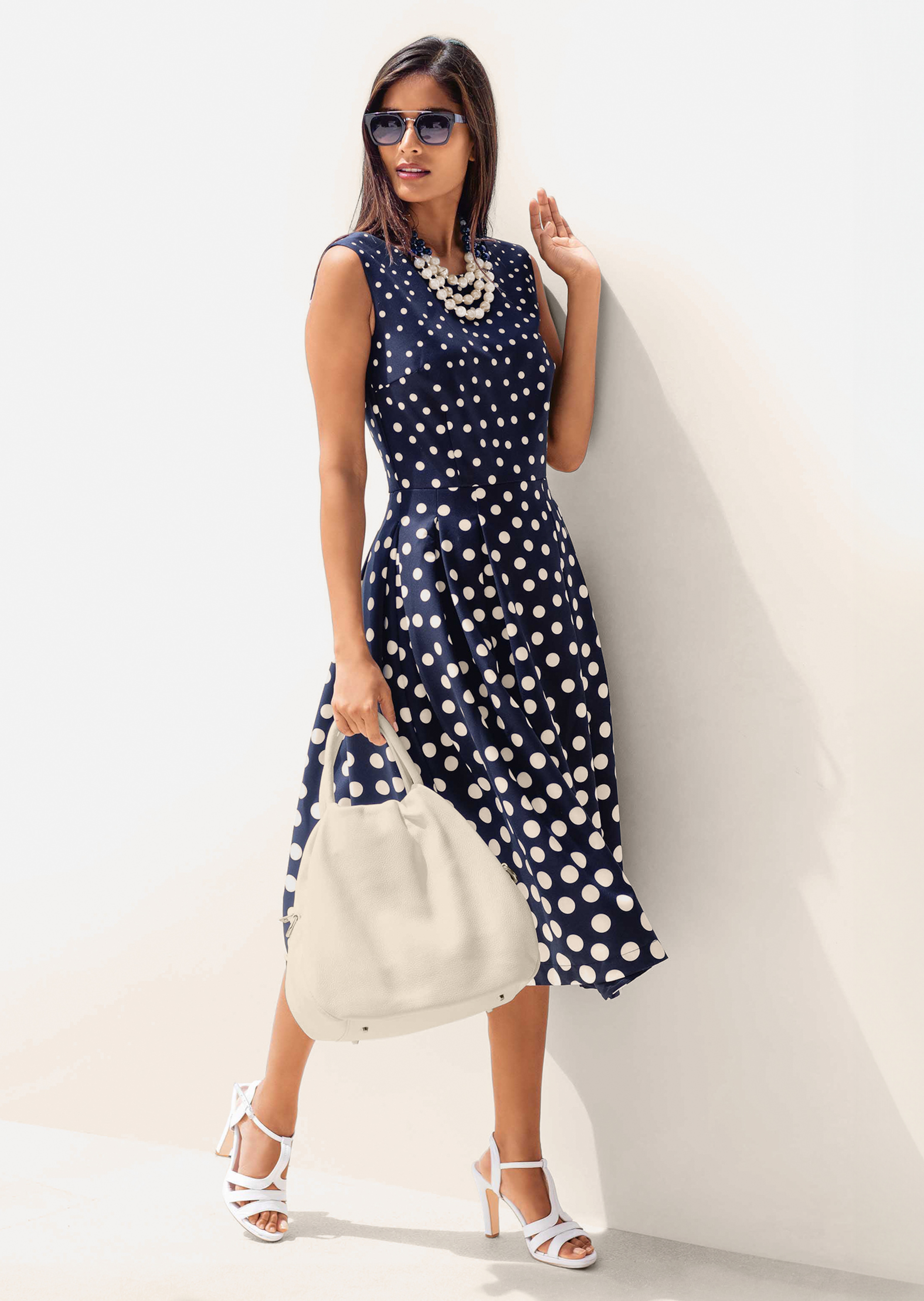 Elegant interpretation of the on-trend polka dot theme. Sleeveless dress with round neckline at the front and a V-neck at the back. Seam-fine side zip. The box pleats lend the skirt buoyancy. Lined bodice.