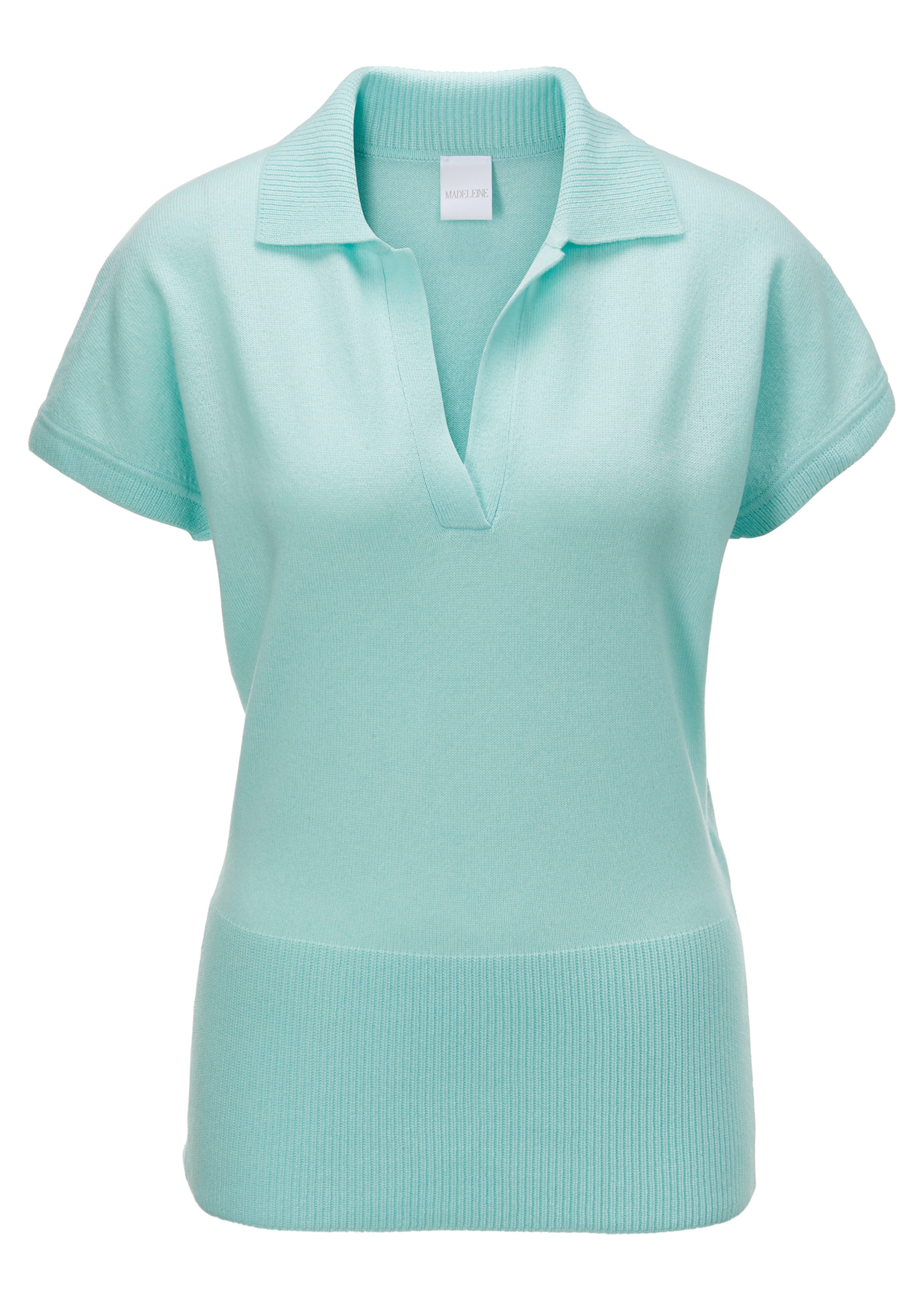 Sheer luxury in a sporty polo style. Snug, soft and wonderfully light to wear. Modern design with V-neckline, characteristic polo collar and short sleeves. This product contains sustainable cashmere produced in accordance with the Aid by Trade Foundation certified THE GOOD CASHMERE STANDARD®.
