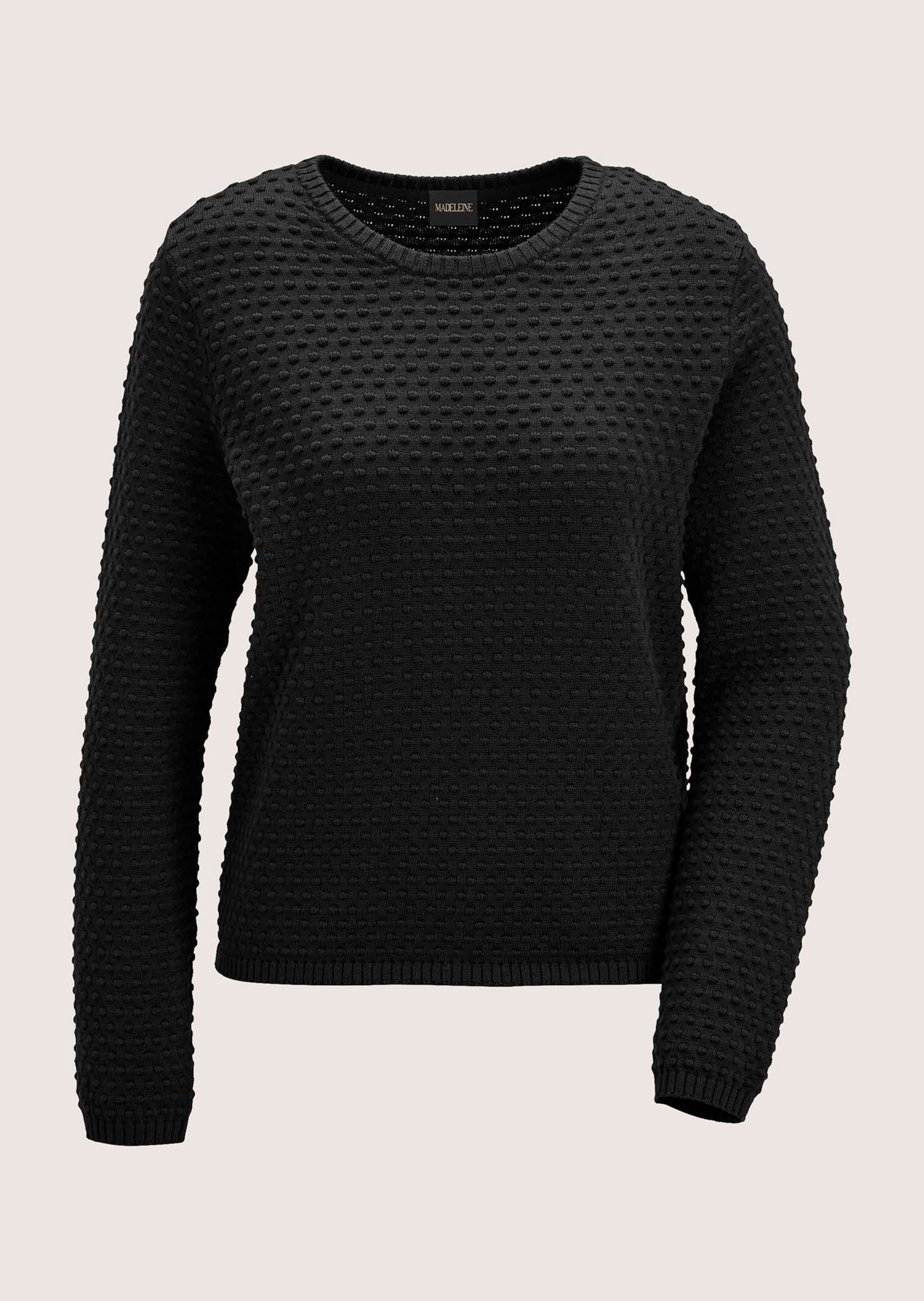 Soft natural fabric with an on-trend nubby texture. In a fashionable short design with a round neckline and long sleeves. Neckline edge and sleeve cuffs with slender ribbed trims. Hem edge with a wide ribbed trim.