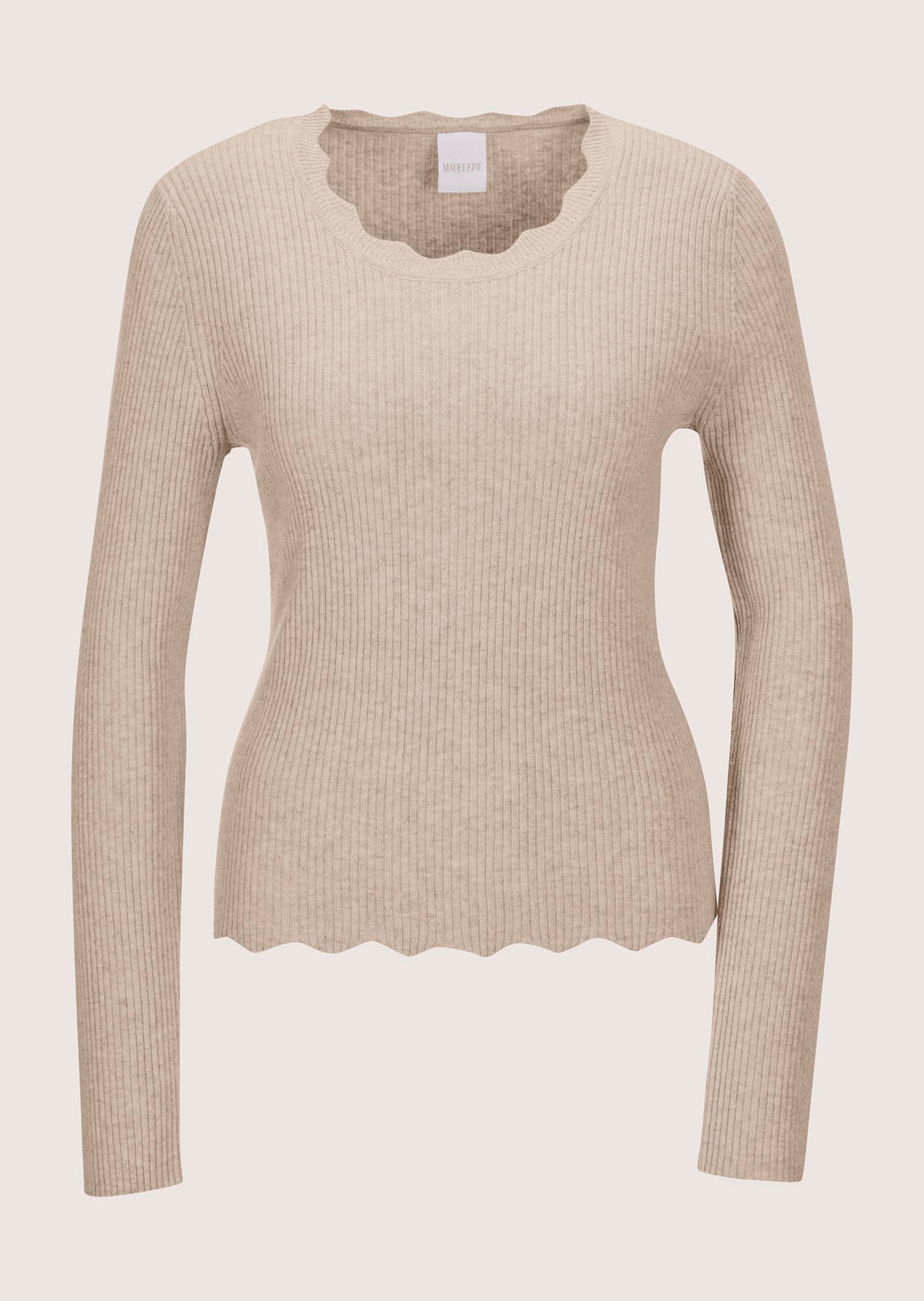 Pleasantly soft yarn blend for a cosy feel. Striking ribbed knit in an elegantly tailored short design with wavy edges at the round neckline and hem. Long, slim sleeves.