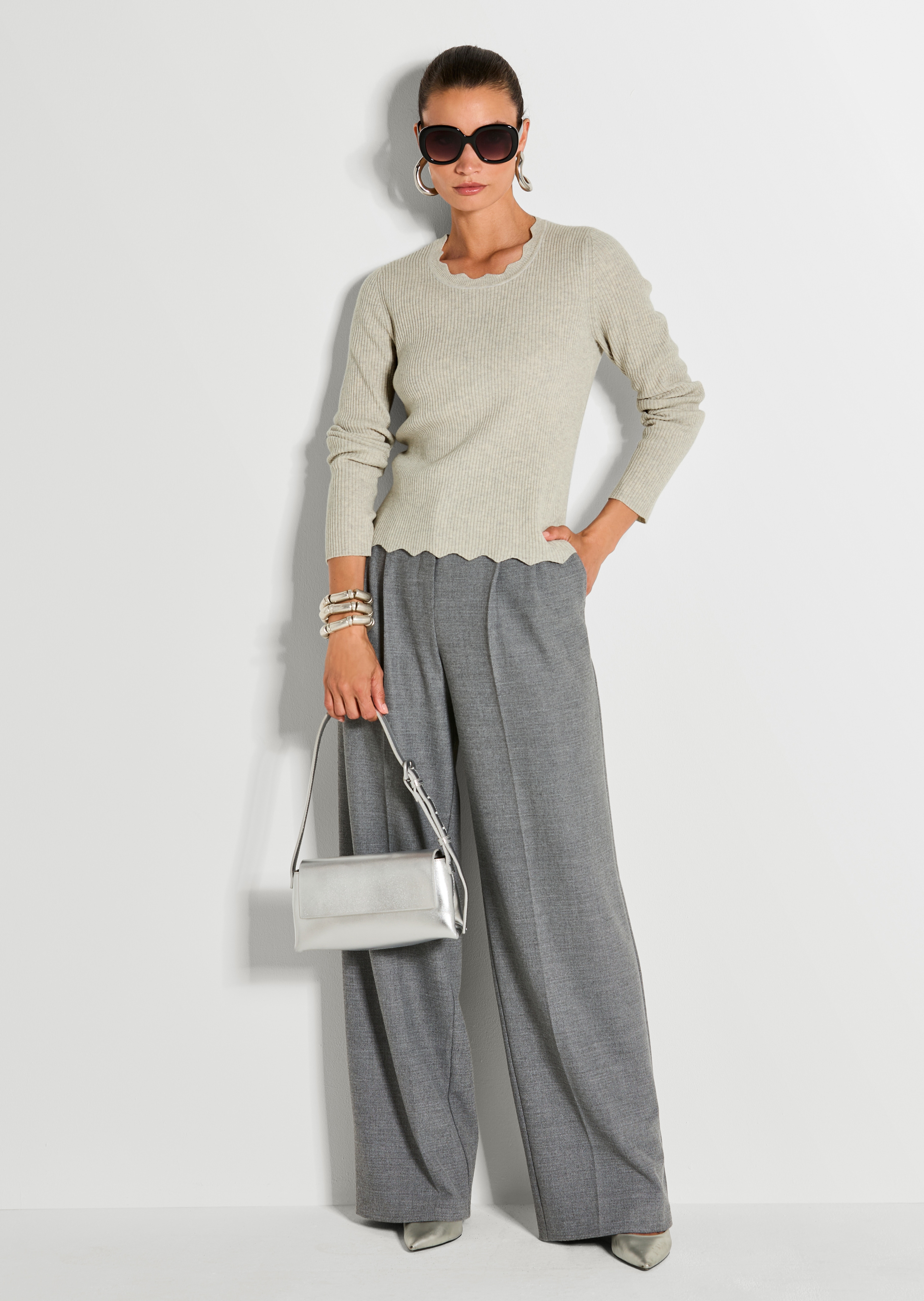Pleasantly soft yarn blend for a cosy feel. Striking ribbed knit in an elegantly tailored short design with wavy edges at the round neckline and hem. Long, slim sleeves.