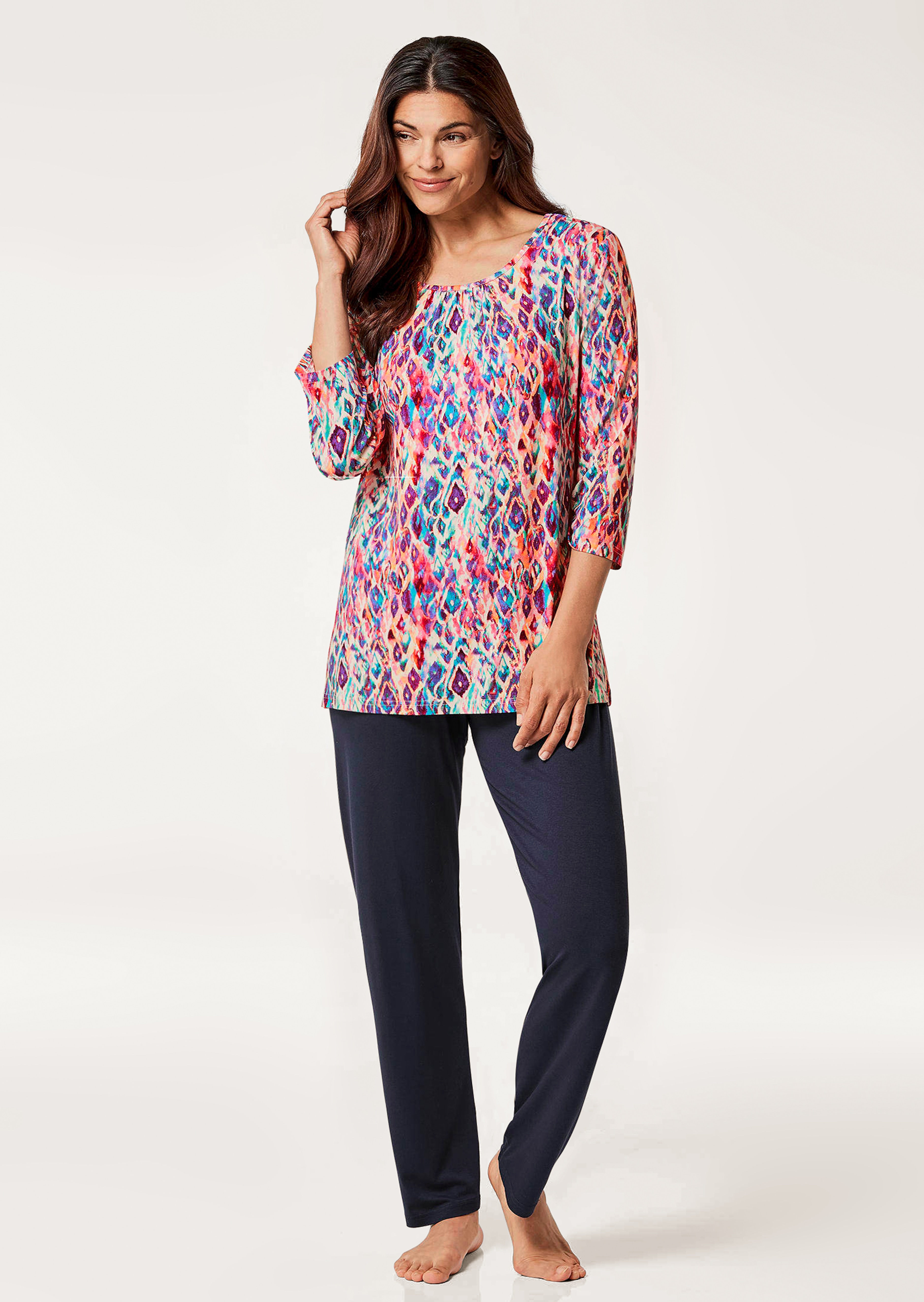 Pyjamas by RINGELLA – the top features a cheerful, colourful print. The 3/4-length sleeves and round neckline with fine small pleats invite you to relax. The plain-coloured trousers with an elasticated waistband have a straight cut to ensure a comfortable fit. The blend of viscose and elastane feels soft and comfortable against the skin and retains its shape over time. A feel-good ensemble for relaxing and dreaming.