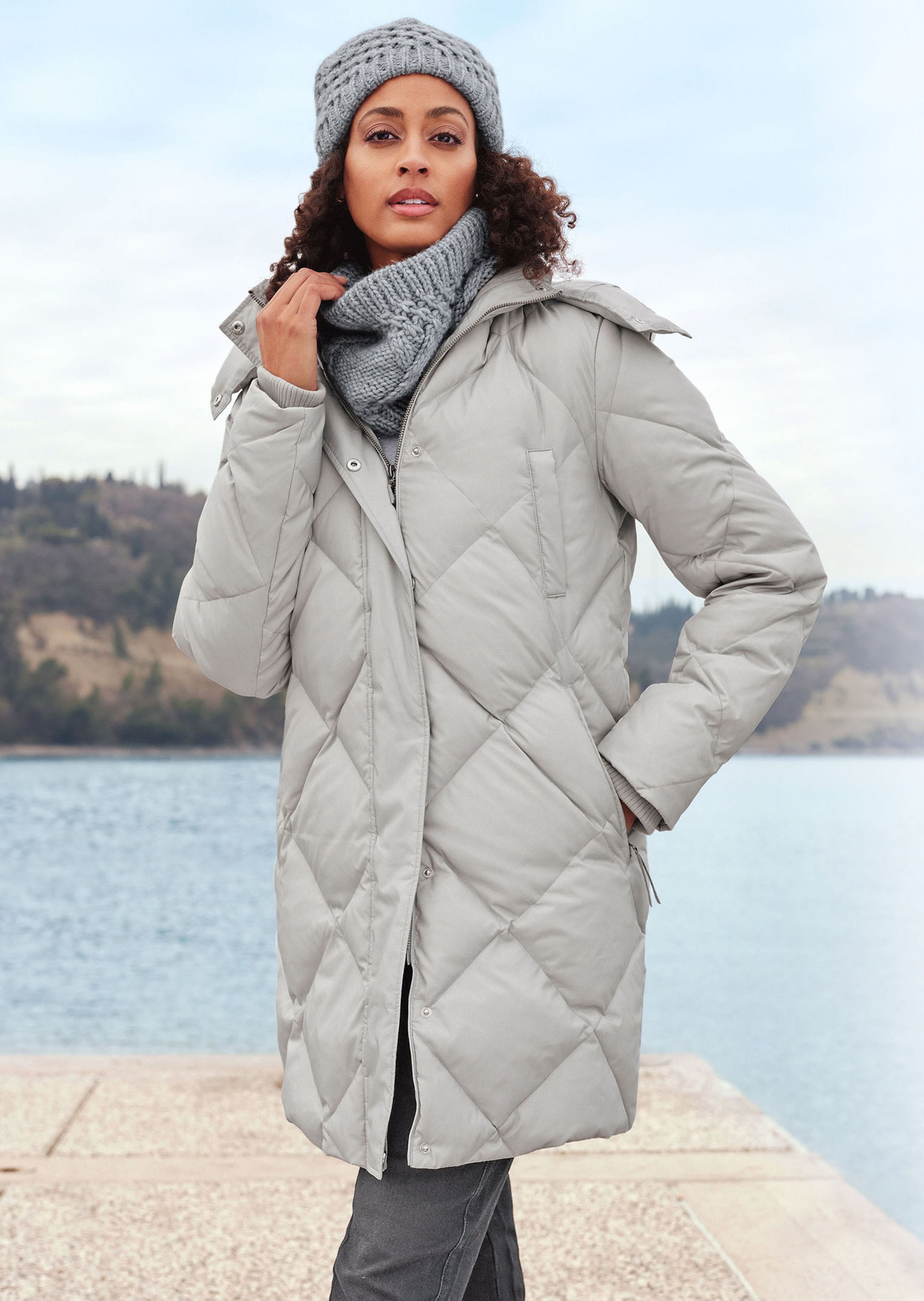 Padded diamond quilting, regular-fit with stand-up collar, hood, long sleeves and concealed press stud placket. Collar and sleeves with ribbed cuffs. Collar with drawstring. Zipper pockets.
