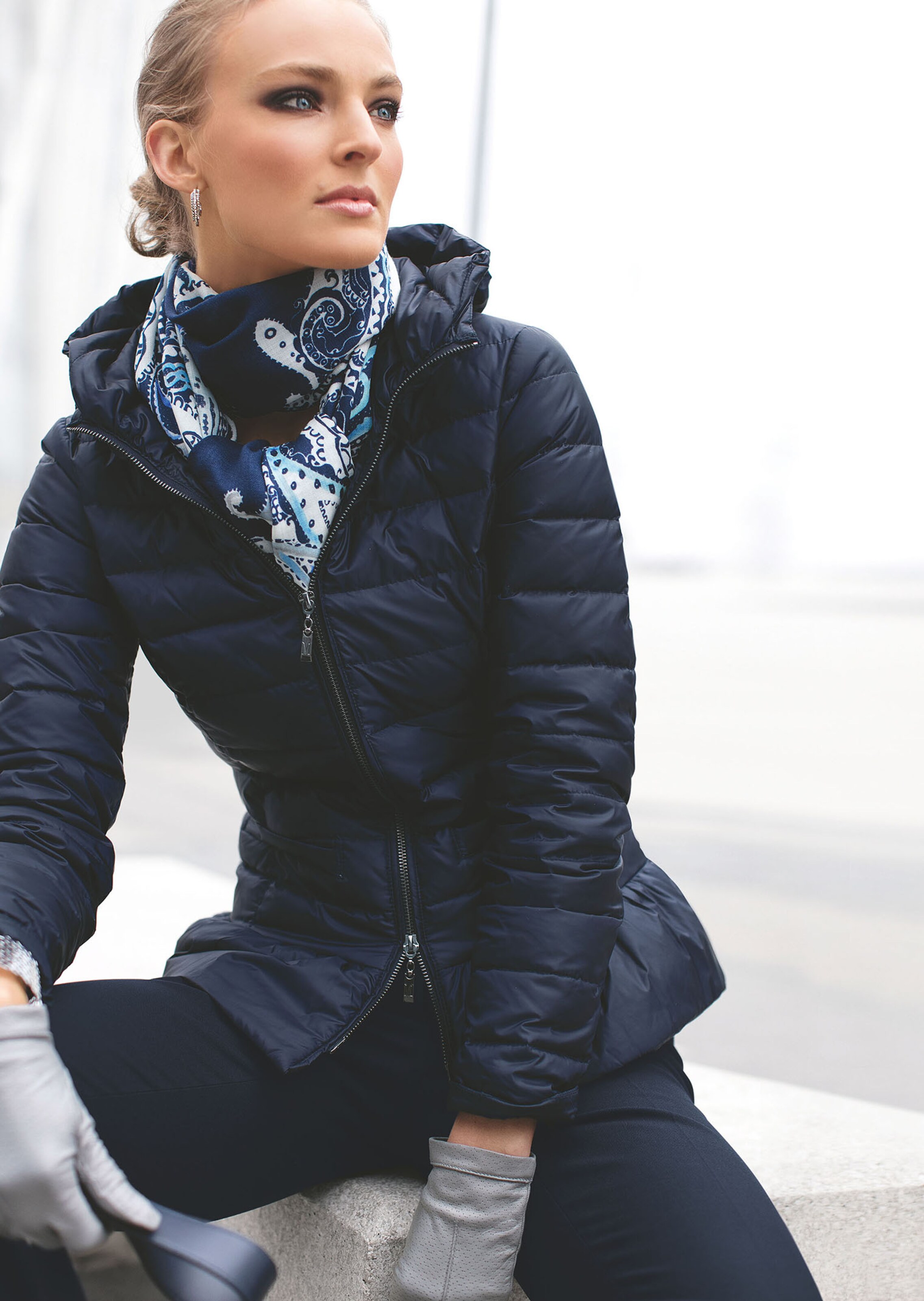 Feminine quilting, an elegant peplum and exciting glossy finish lend this jacket its exclusive, high-fashion character. Form-fitting shape with two-way zip, long sleeves, two welt pockets and hood with drawstrings. Ultra-light and comfortably warm.