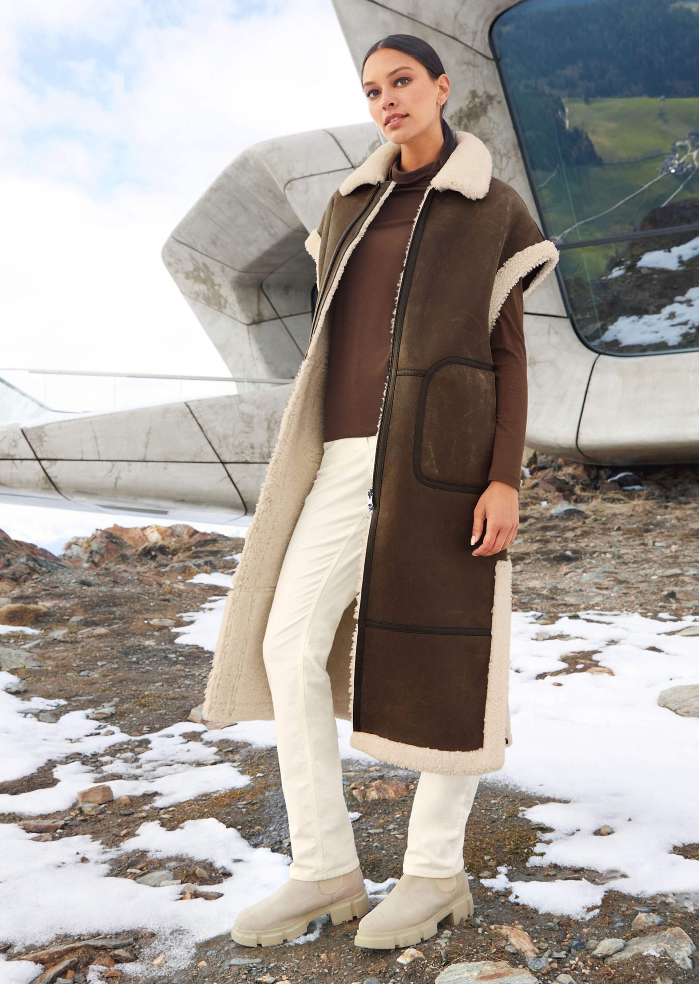 Cosy and warm luxury piece in stylishly oversized design. Reversible waistcoat with fluffy fleece side and smooth nappa reverse. Fleece side finished with welt pockets, nappa side with patch pockets. With 2-way zip and high side slits. Fleece collar on either side.