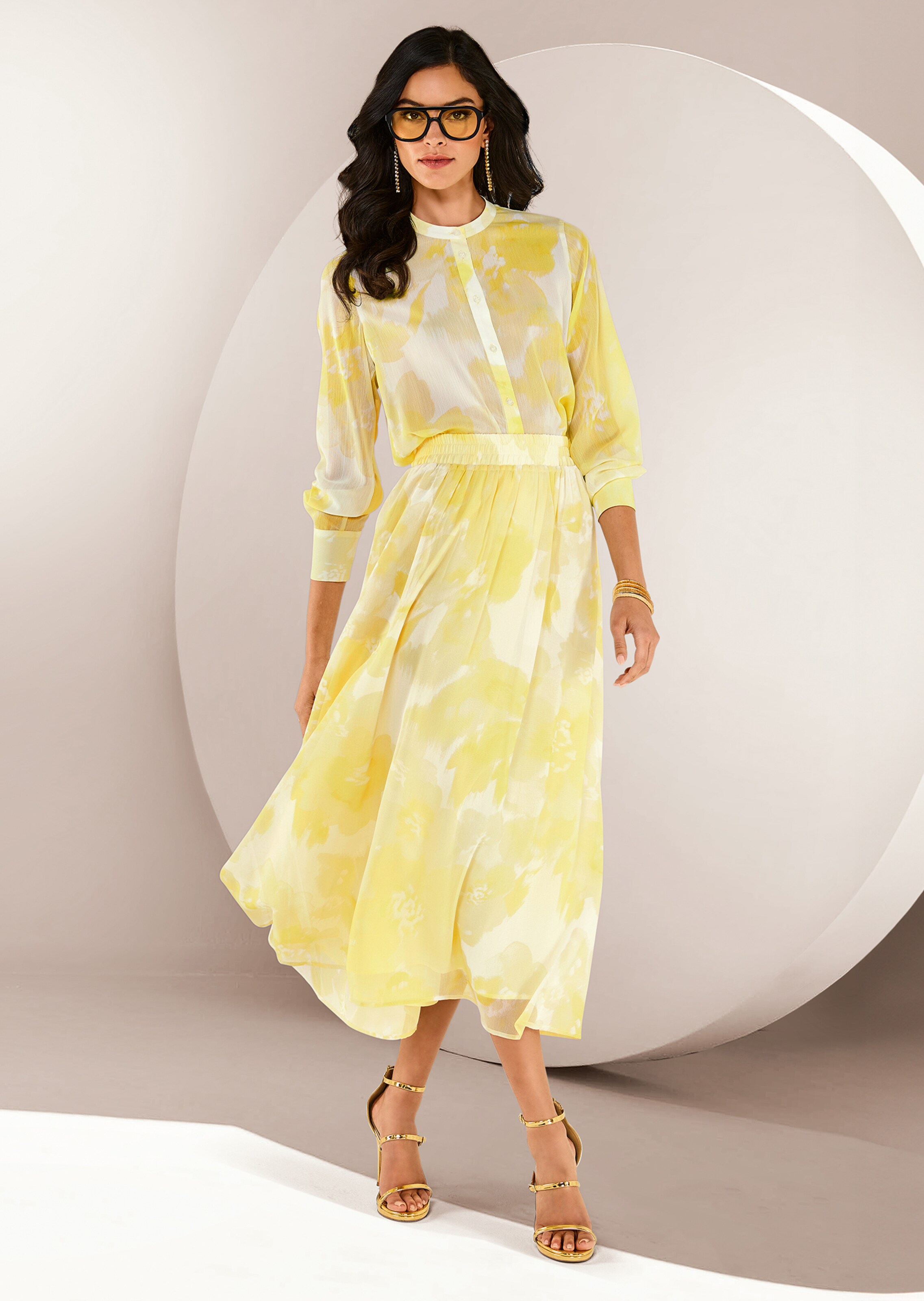Softly flowing, delicate and transparent with a beautiful all-over floral print - each piece is a one-off! Straight shape with a slightly elongated back, round neckline, long cuffed sleeves and side vents. Original MADELEINE buttons.