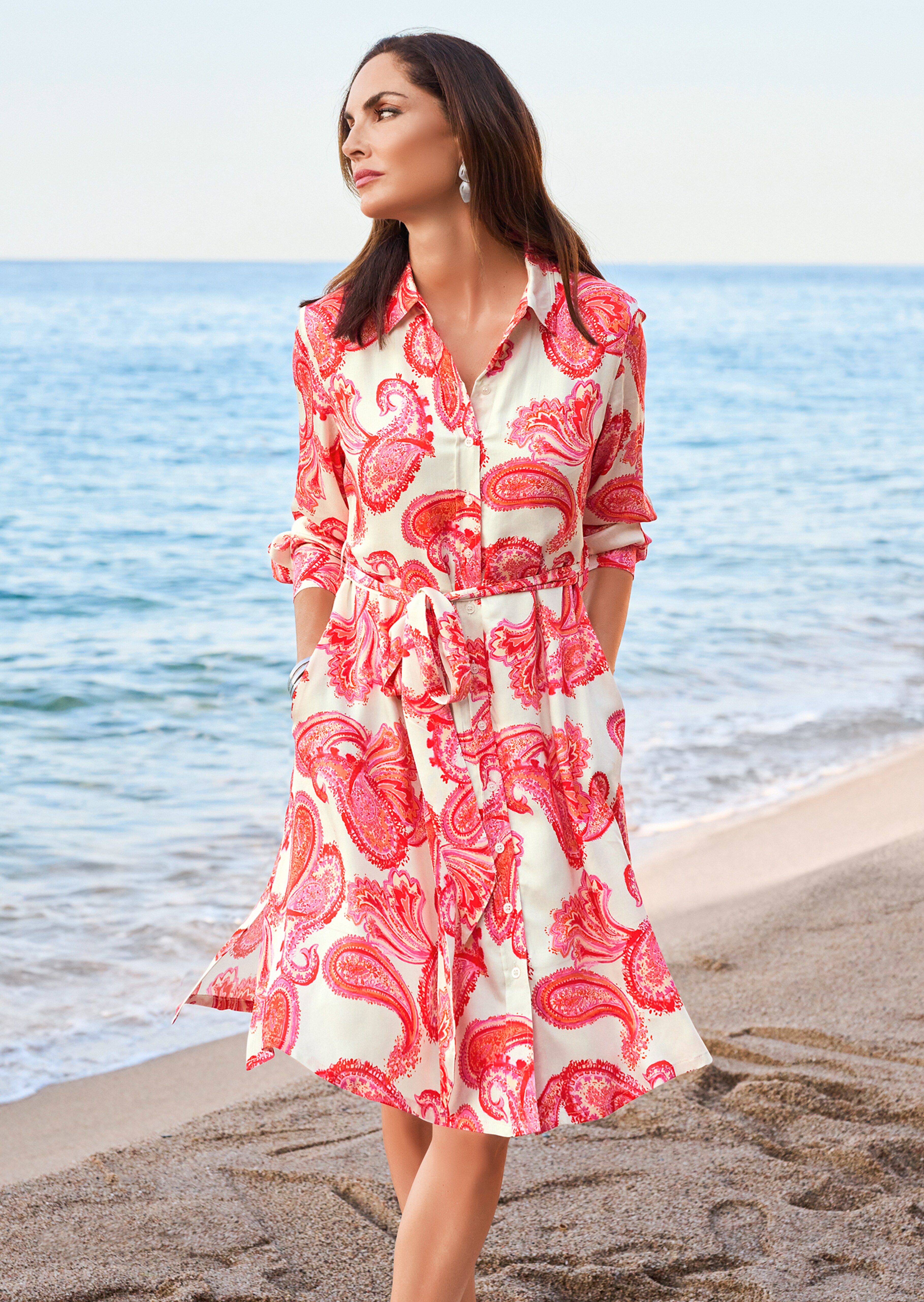 Softly flowing fabric in a colourful all-over print. With a shirt collar, full-length button placket, long cuff sleeves, side slits and hem vents. Waist seam with drawstrings. Back yoke.