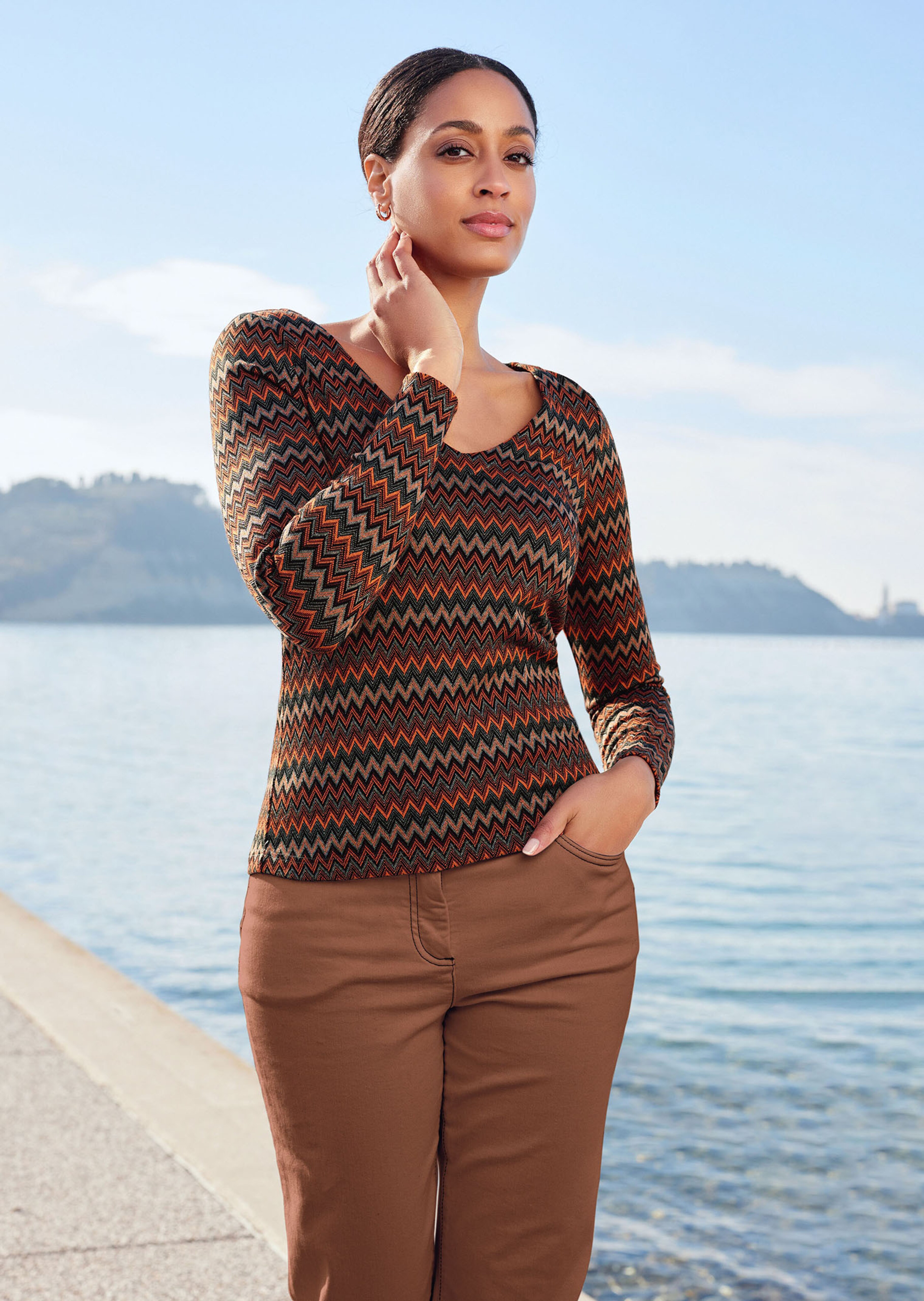Casual top made of finely patterned viscose blend. Feminine tailored with large V-neckline and long sleeves. Crease-resistant.