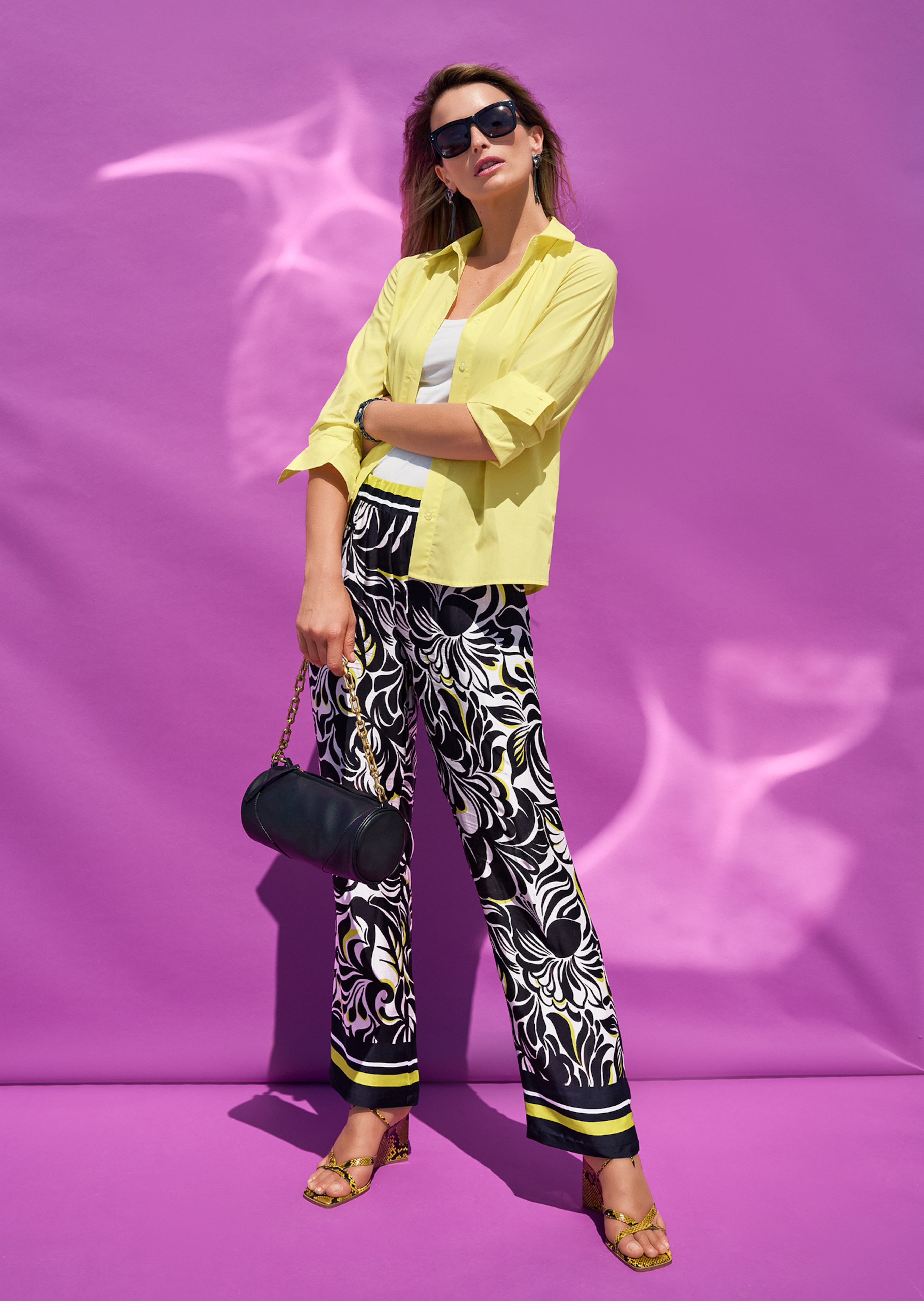 Soft material blend, pleasantly cool on the skin and slightly transparent. With a shirt collar, full-length button placket and long cuffed sleeves. Slightly rounded hemline.