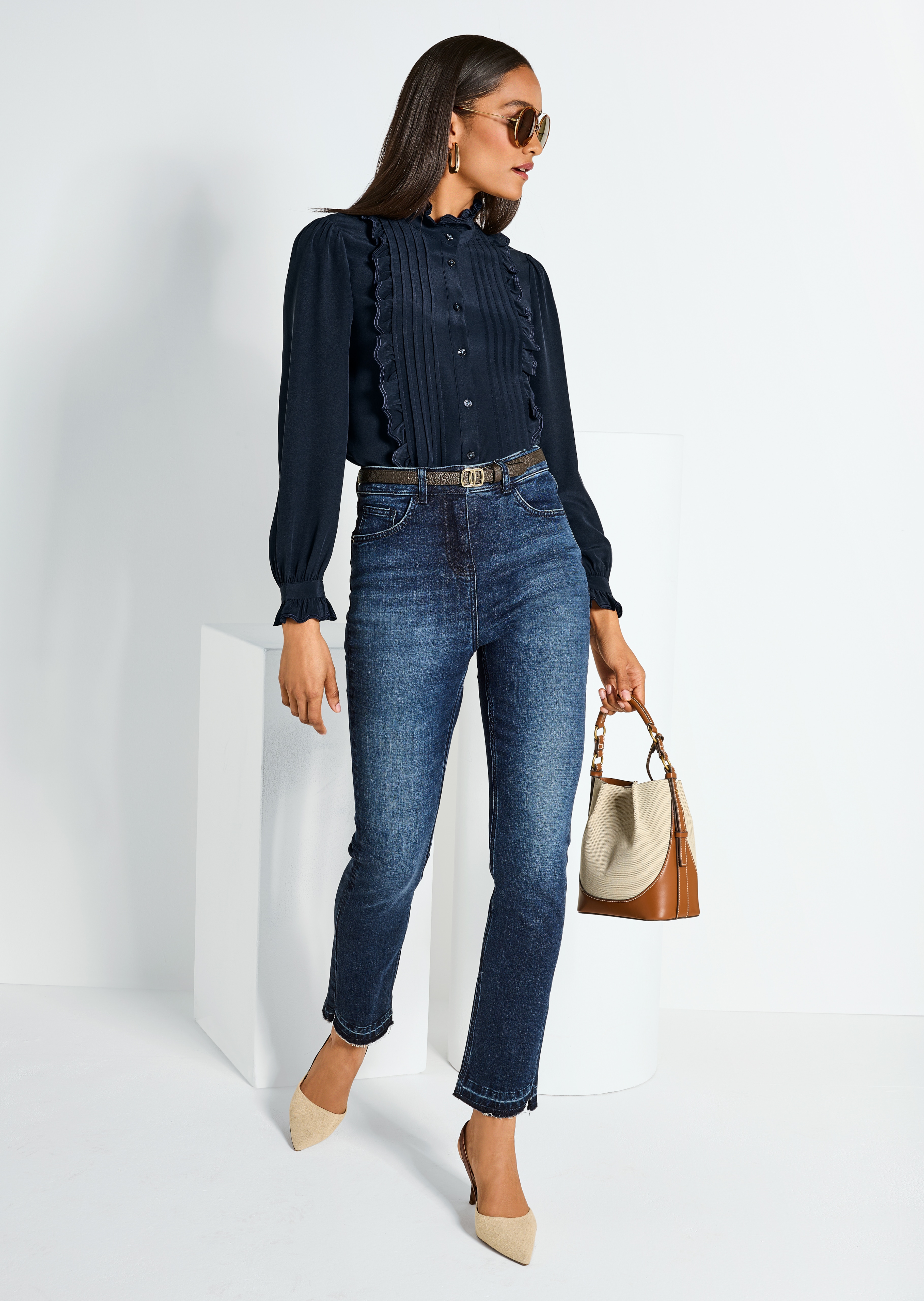 Made from softly flowing viscose with a subtle shimmer. Elegant, playful look with embroidered frills on the stand-up collar, front and cuffs. Full-length button placket with chic piping on both sides. Frilled back yoke. Rounded hem edge.