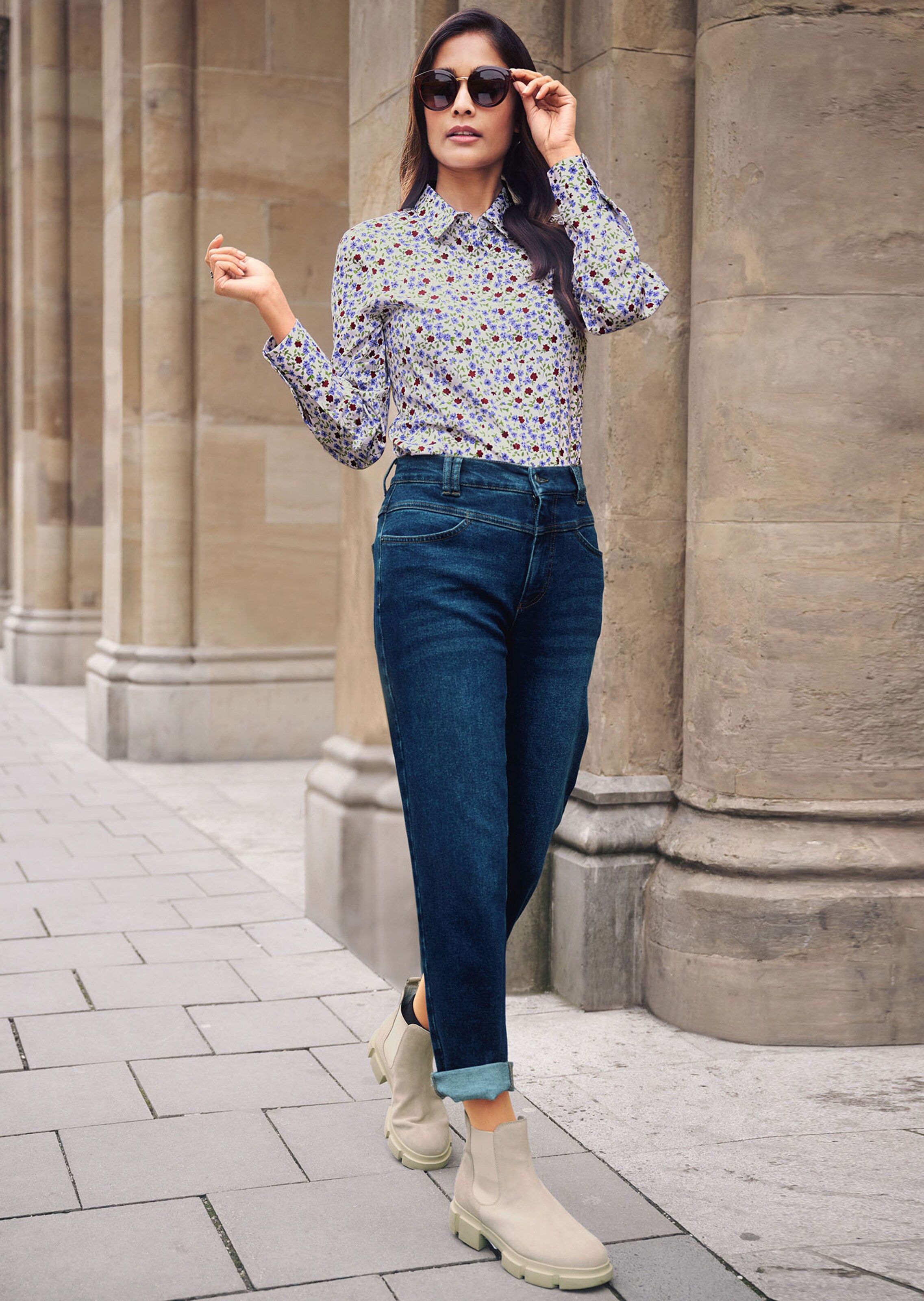 Refreshingly modern with delicate millefleurs print all over and fashionably shortened, boxy shape. Comfortable to wear with shirt collar and long sleeves.
