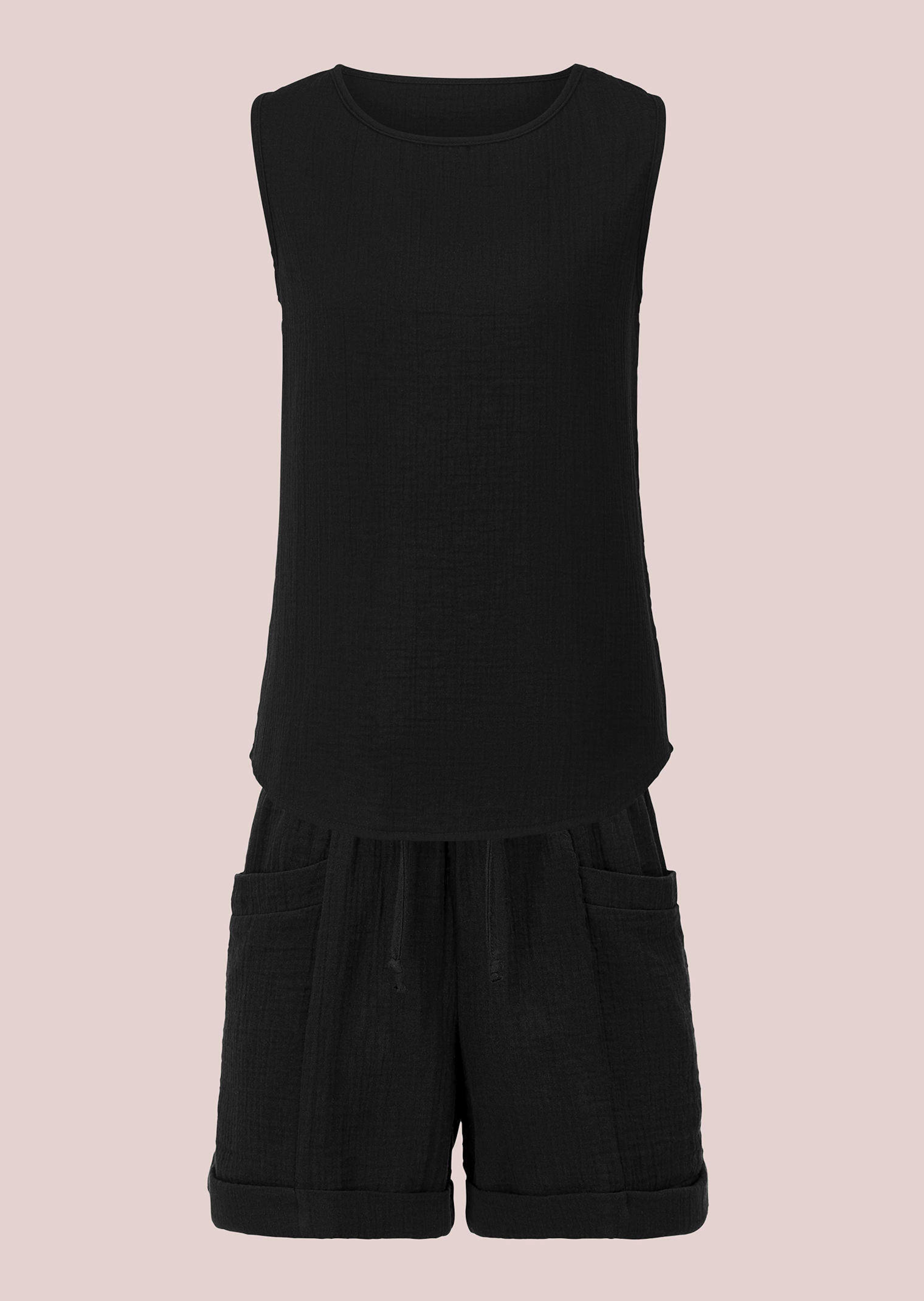 This shorty set by PLANTIER made of pure cotton ensures a natural feel against the skin and maximum breathability. The sleeveless top with a round piped neckline harmonises with the shorts, which have a wide elasticated waistband, drawstrings and patch pockets. The rounded hem of the top and the turn-up cuffs on the shorts round off the casual, summery design. Ideal for warm days and relaxing hours.