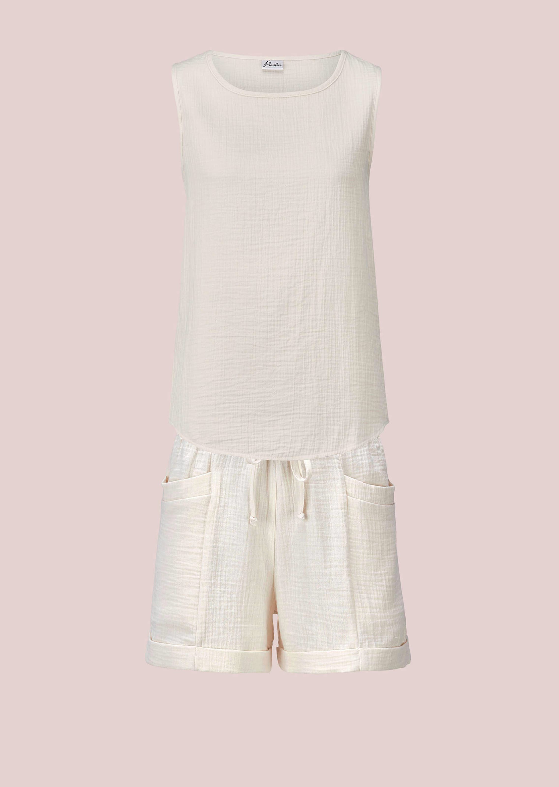 This shorty set by PLANTIER made of pure cotton ensures a natural feel against the skin and maximum breathability. The sleeveless top with a round piped neckline harmonises with the shorts, which have a wide elasticated waistband, drawstrings and patch pockets. The rounded hem of the top and the turn-up cuffs on the shorts round off the casual, summery design. Ideal for warm days and relaxing hours.