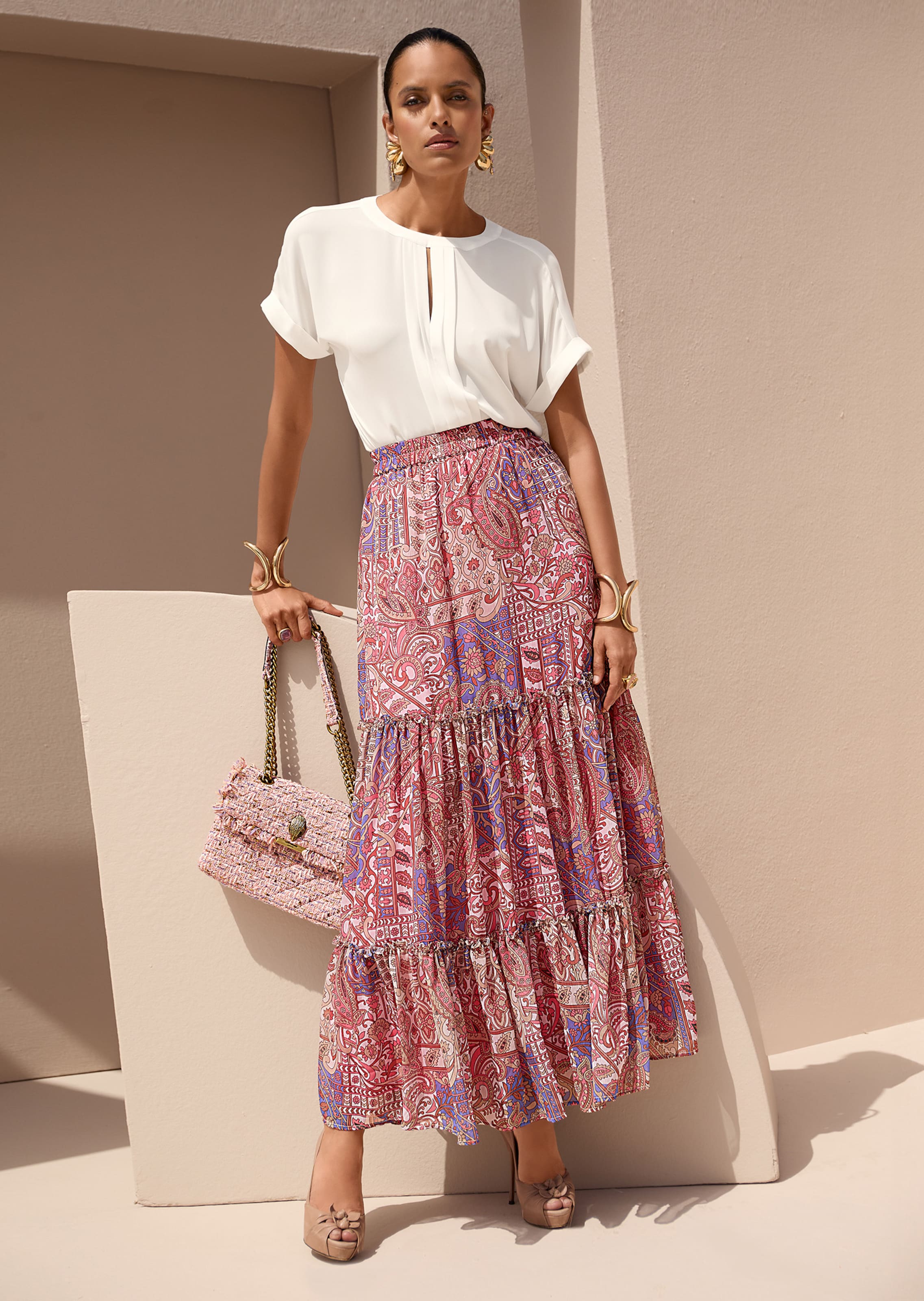 Fashionable crinkle fabric with all-over enchanting floral imprimé – each piece is a one-off. Tiered skirt with an elasticated waistband, comfortable to slip into.