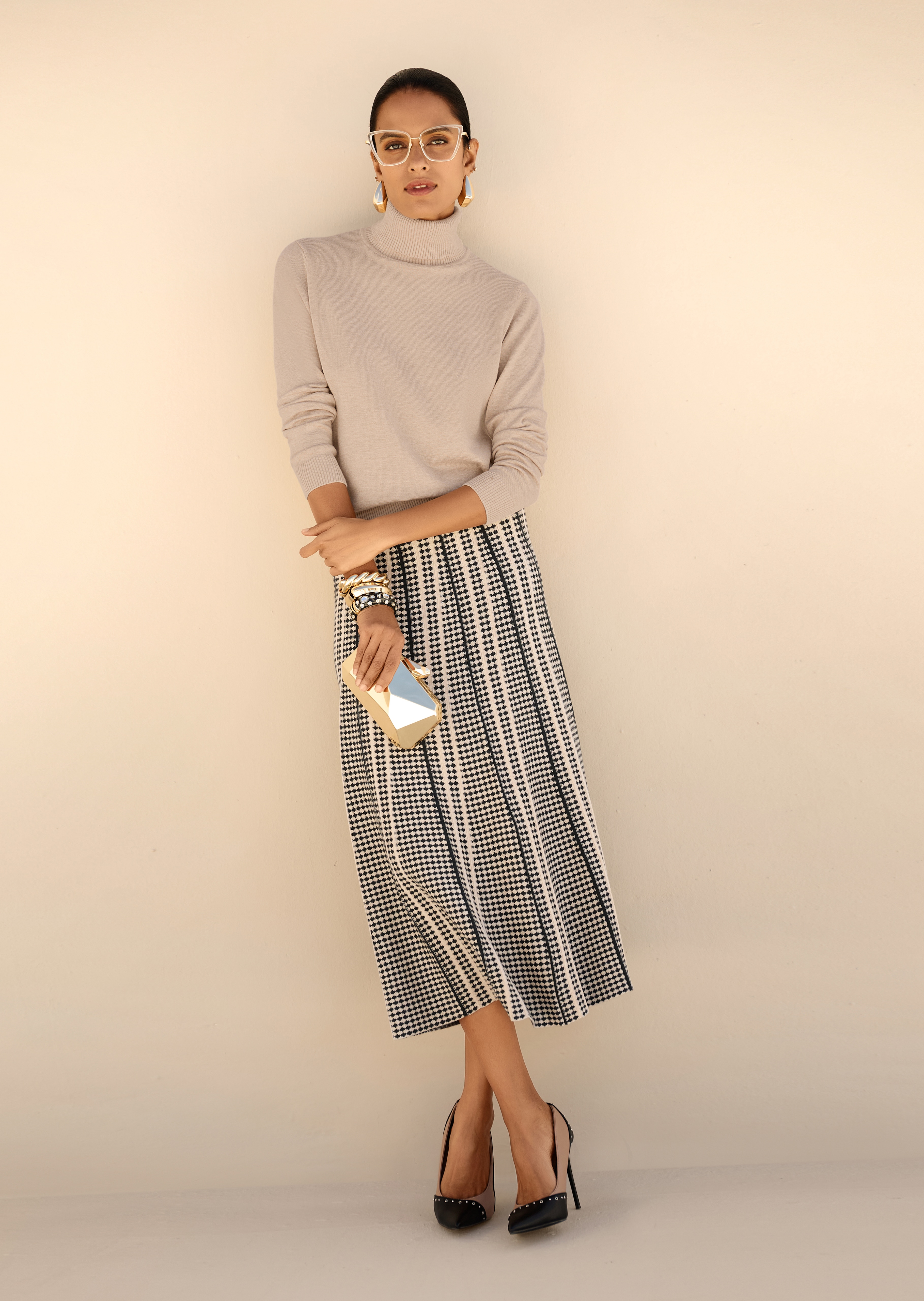 Soft knit in a fashionable, attractive length, crafted horizontally and with a high-quality jacquard pattern all over. Comfortable to wear and in a slightly flared shape with an elasticated waistband.