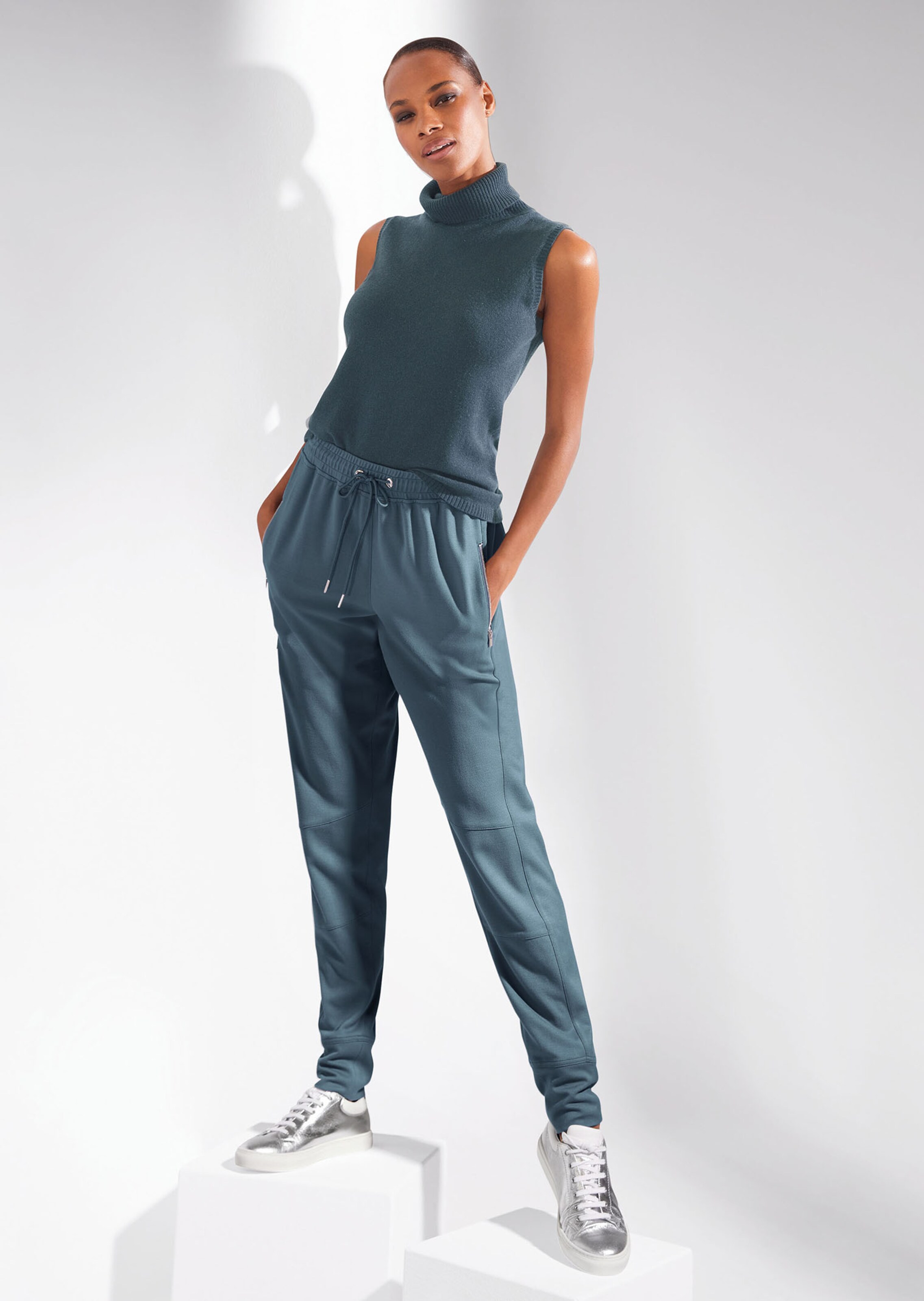 Soft and fluffy smooth knit in moderately fitted shape. Sleeveless design with ribbed polo neck. Narrow ribbed trim on sleeve openings and hem.