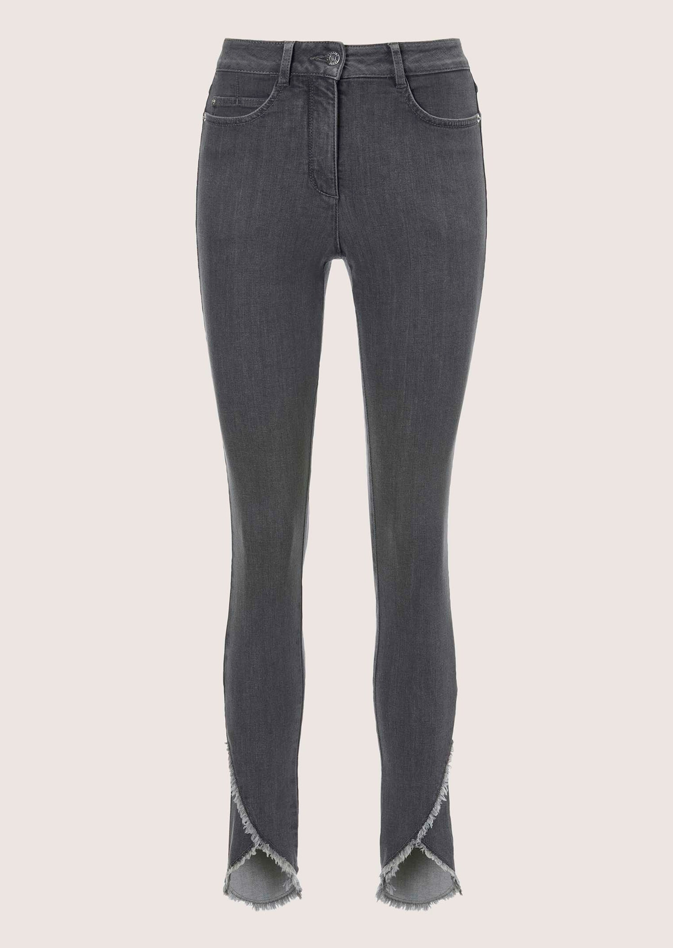 Slim 5-pocket design with shaped waistband, belt loops, shaped yoke at the back and on-trend fringed hem.