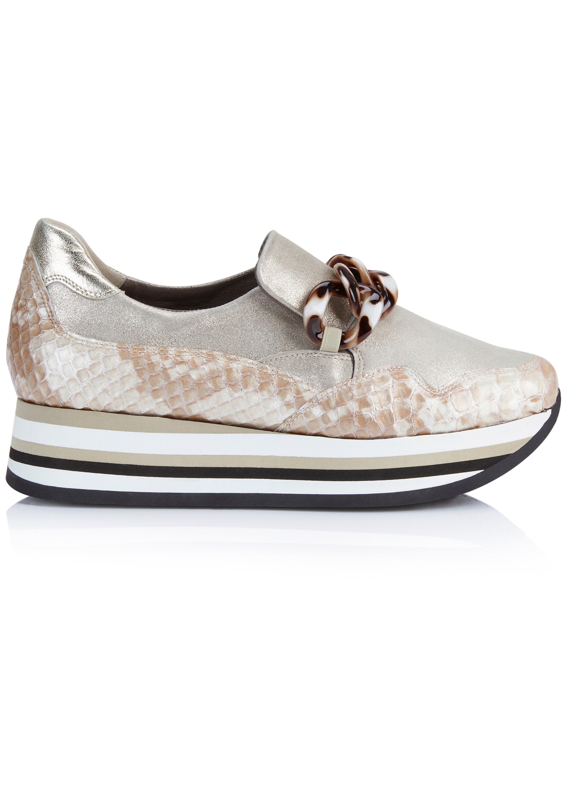 Handmade in Portugal in striking mix of leathers. With decorative chain and removable inner sole. Contrasting platform sole for top comfort.