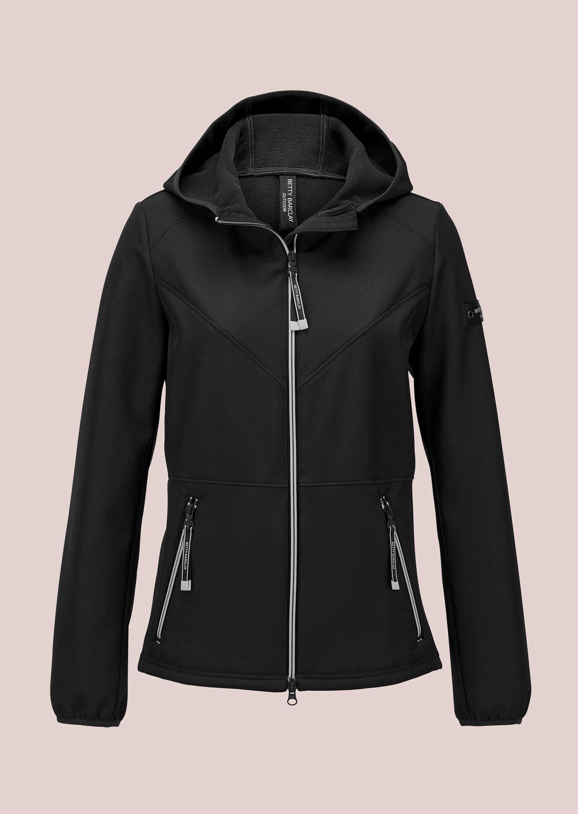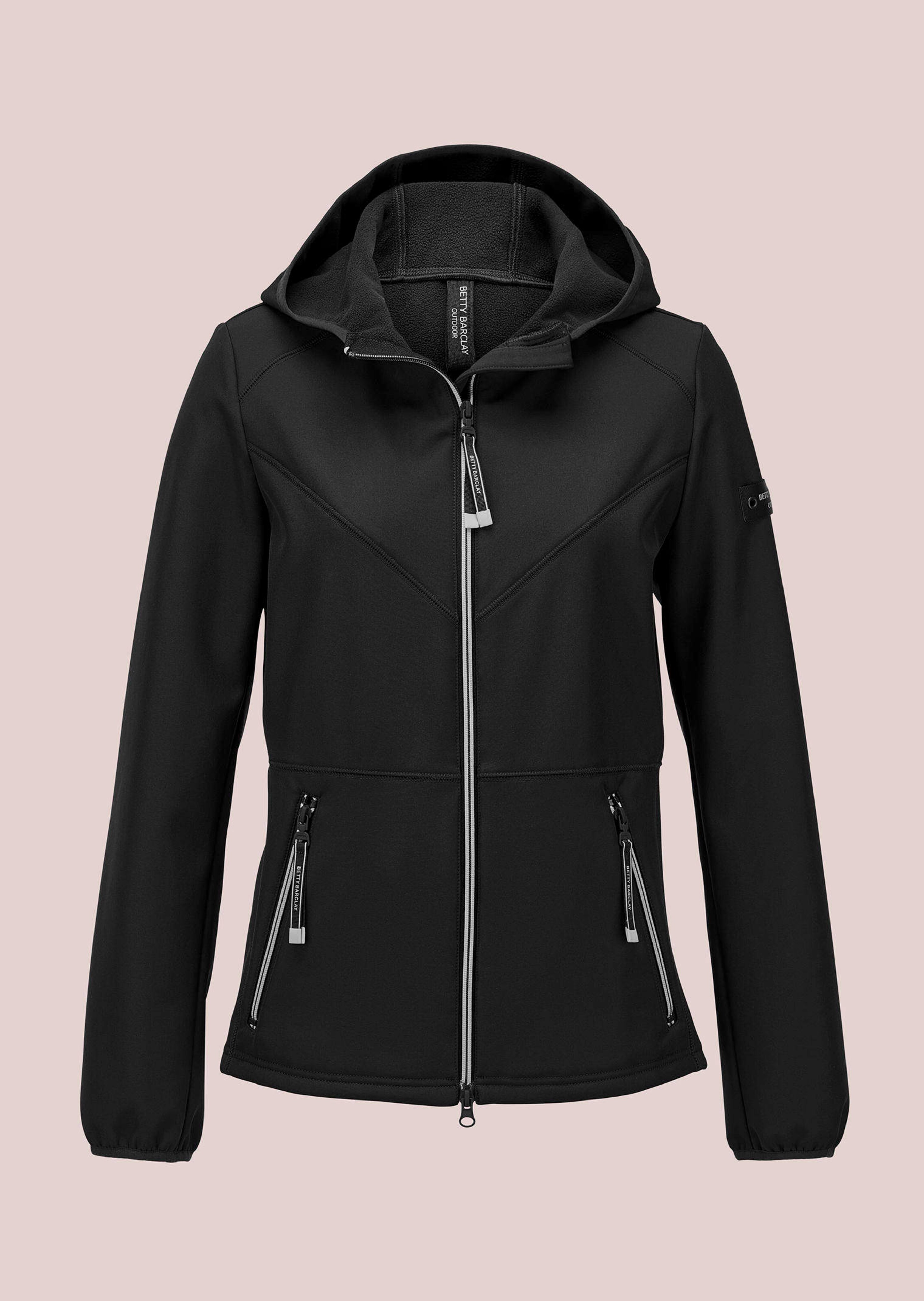 Top-quality leisure jacket by BETTY BARCLAY for sporty looks: softshell with a fluffy inside ensures comfort and enjoyment. The full-length zip, attached hood and two zip pockets with decorative zip pulls are functional highlights. Dividing seams and stitched decorative seams shape the jacket, while elasticated cuffs on the sleeves ensure a perfect fit. Ideal for everyday wear, outdoor activities and active leisure time.