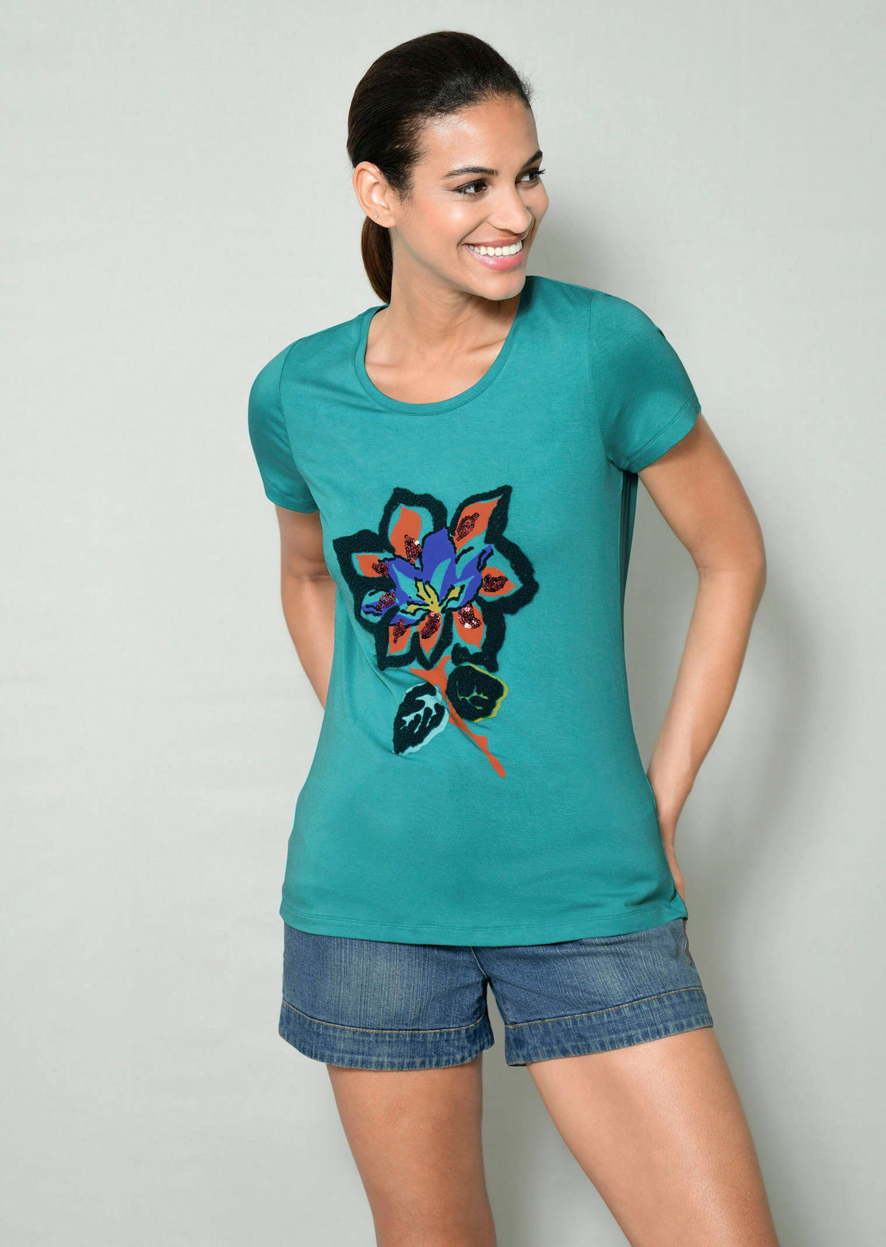 Entdecken Sie Ihren ganz individuellen Favoriten – wie zum Beispiel dieses Strandshirt von Alba Moda. Besonders hervorzuheben sind der Motivdruck und die Applikation. Es verfügt über einen Rundhalsausschnitt. Es ist gerade geschnitten. Kurzer Ärmel mit geradem Abschluss. Gefertigt aus Viskose. Übrigens: Ein Outfit ist natürlich erst fertig, wenn auch Schuhe und Tasche passen. Zwei Dinge sollten hier harmonieren: Farbe und Stil. Tragen Sie also zum Beispiel Pumps, ist auch eine elegante Handtasche gefragt. Die Farbe muss zwar nicht mehr wie früher genau die selbe sein, "beißen" sollten sie sich aber auch nicht. In unserem Onlineshop haben Sie eine riesige Auswahl an Produkten – lassen Sie sich das Strandshirt von Alba Moda ganz einfach nach Hause schicken!