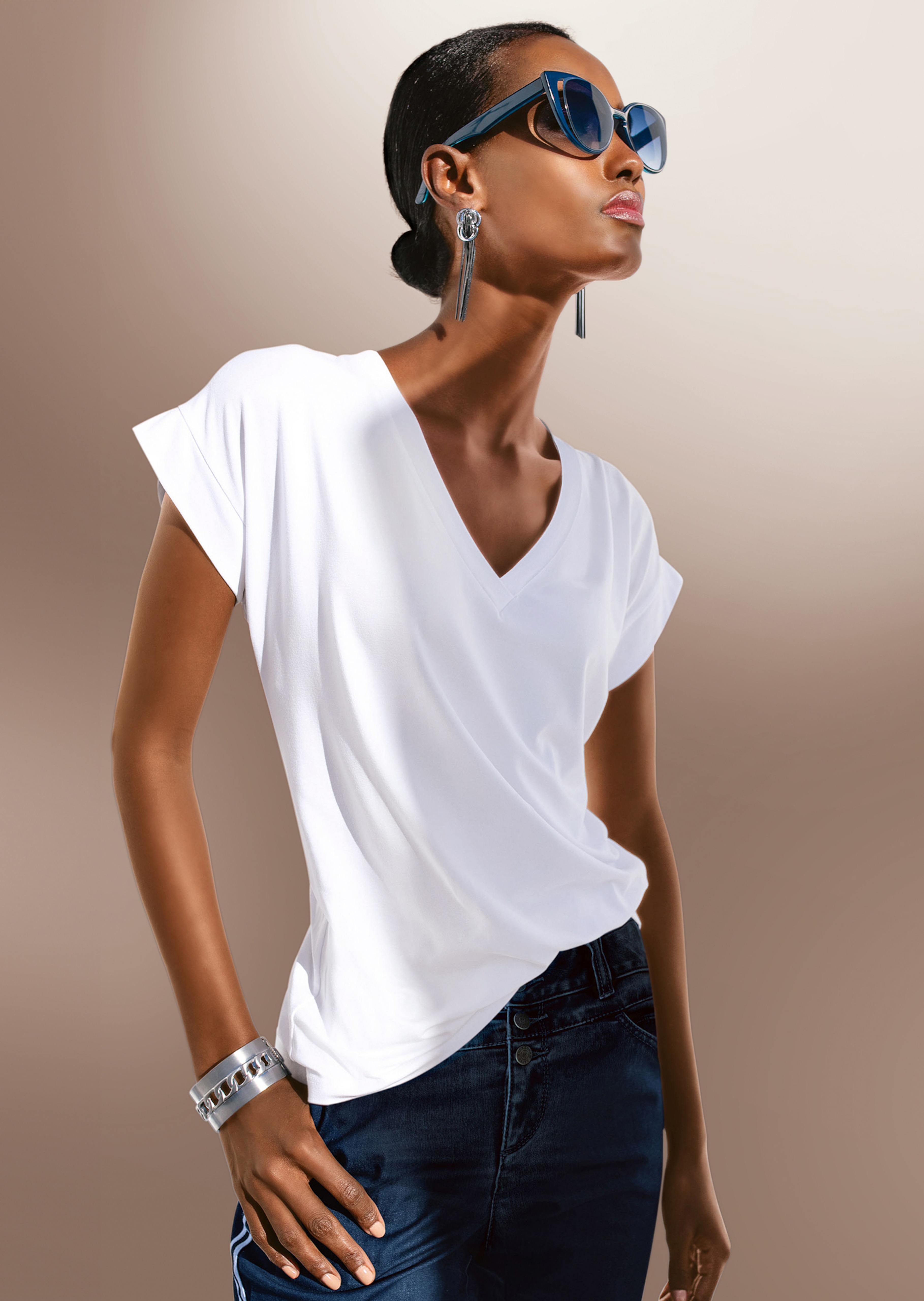Casual cut with a V-neckline and dropped shoulder with wide trims.