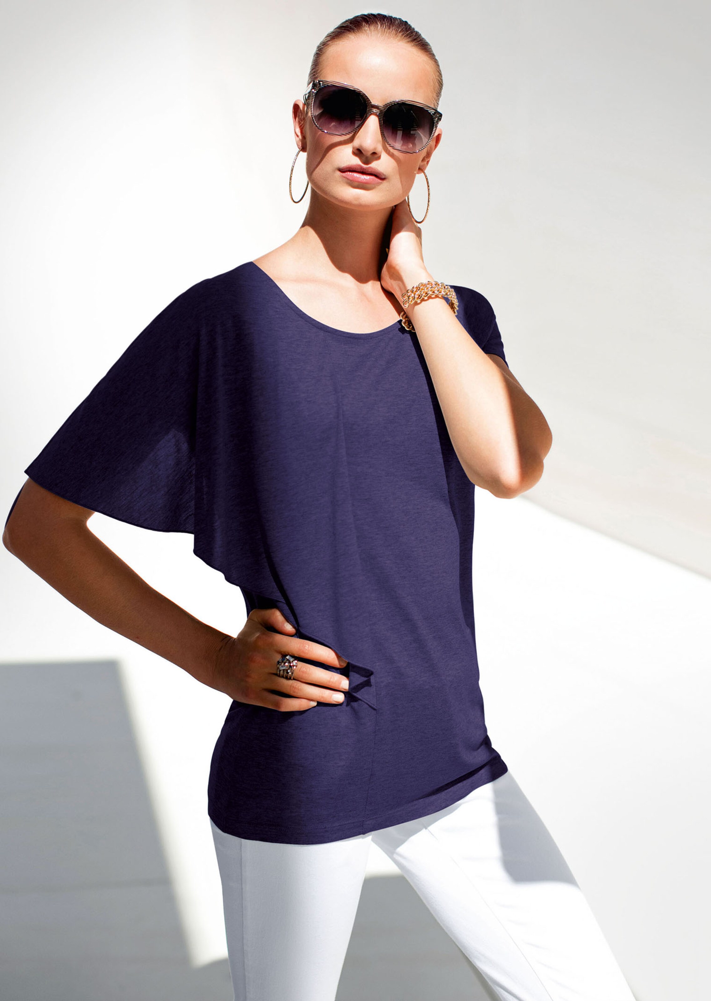 The softly falling flounce insert at the front adds an on-trend style element to this garment. Feminine basic top exhibiting fashionable extravagance. Figure-flattering cut with round neckline and short raglan sleeves. Comfortable, breathable and easy to care for.