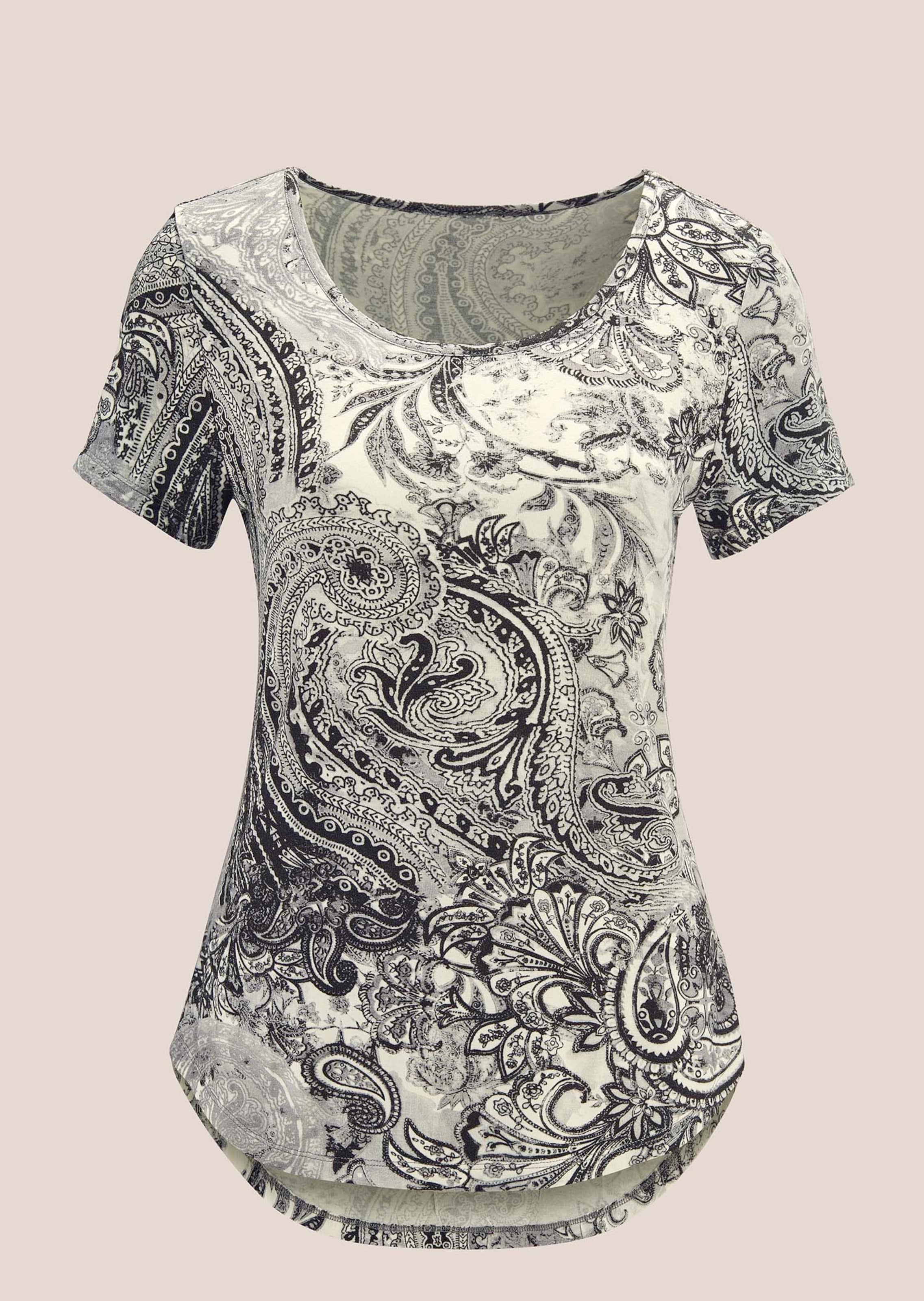 The cool jersey fabric made from flowing stretch viscose and the enchanting paisley print make this top a real pleasure to wear. With a round neckline, short sleeves and a straight hem. Moderately tailored, elegant shape.