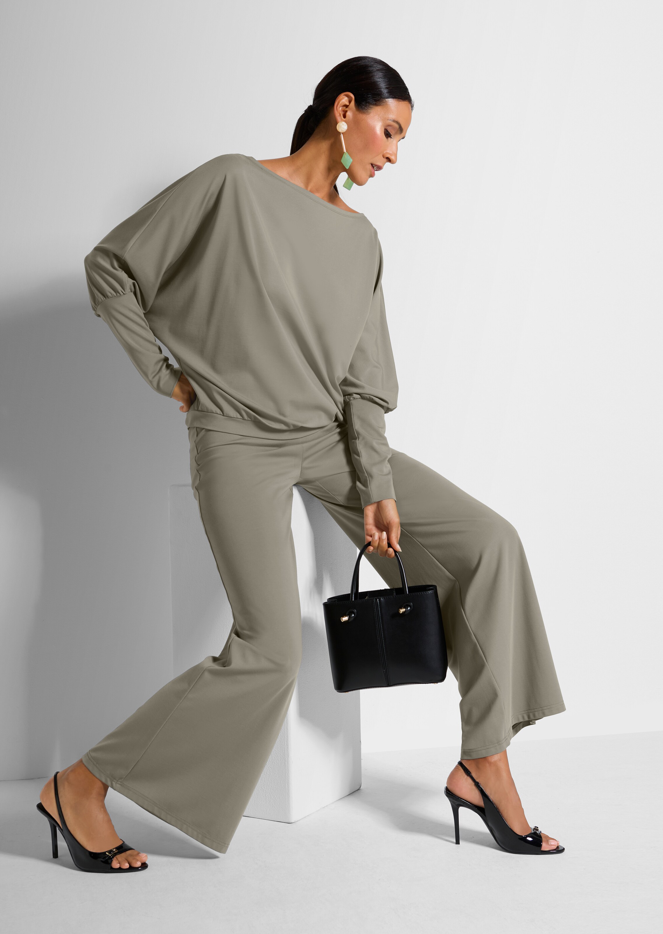 This jersey top with stretch is perfect for cosy weekends at home, at the spa or for days off. Lavish boat neckline and batwing sleeves with wide cuffs and fine gathers. A slender waistband at the hem provides a beautiful finish.