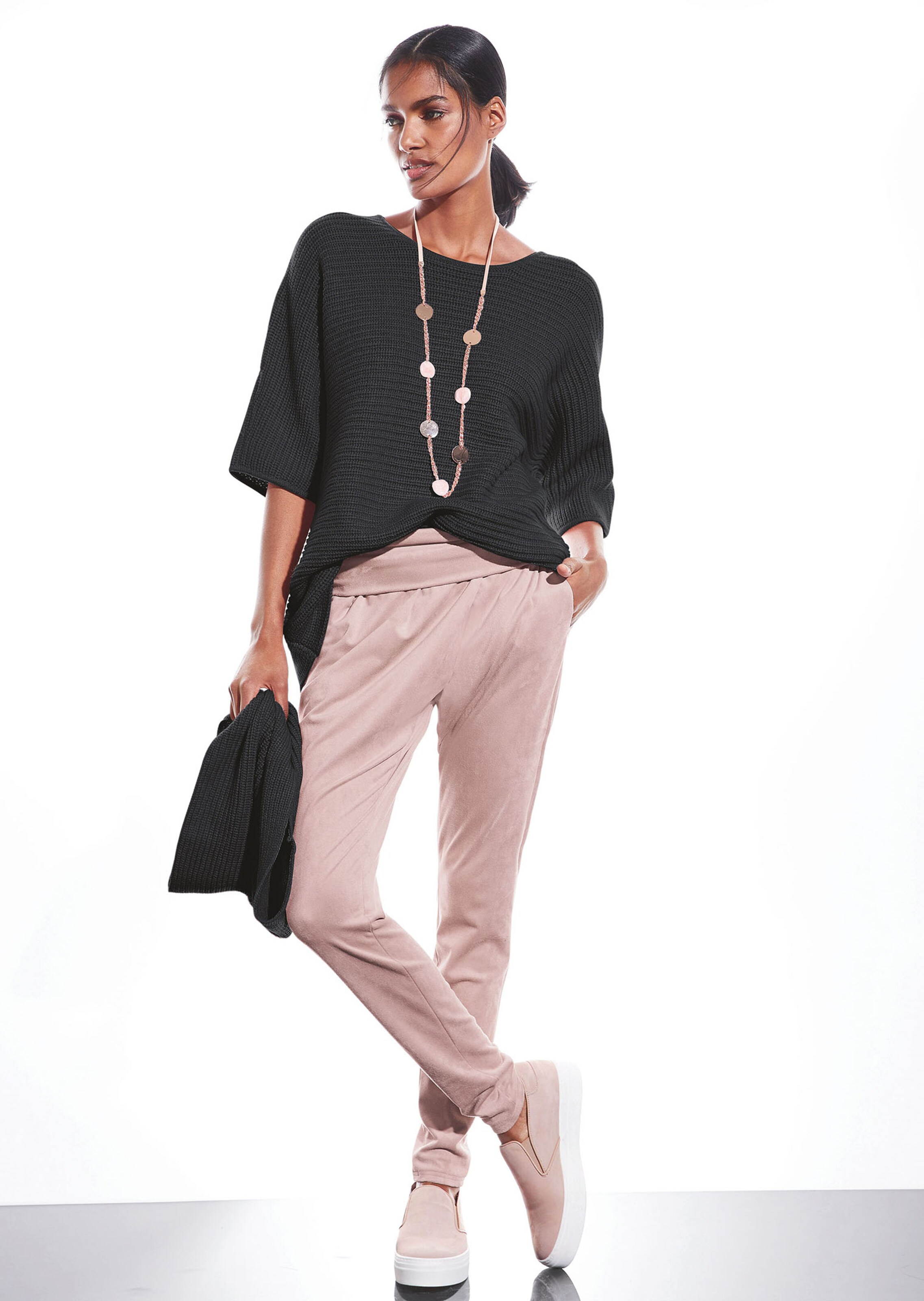 The wonderfully soft peach-skin fabric looks deceptively like real suede, while also offering plenty of stretch comfort. Casual shape with sophisticated draping, side pockets and a high turnover waistband.