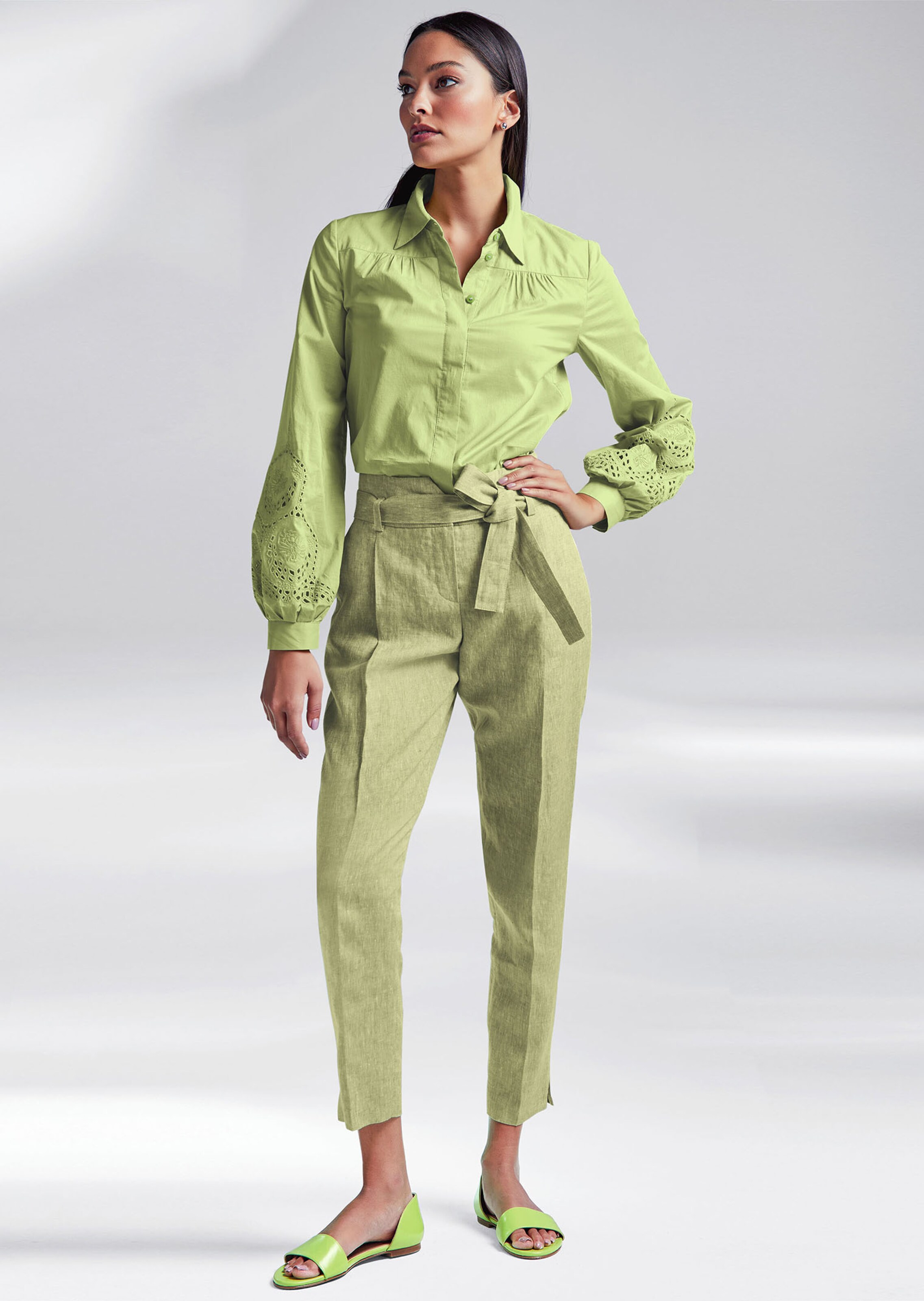 Tapered high-waist shape with pleats, centre creases, slanted pockets, small hem slit and detachable tie belt.