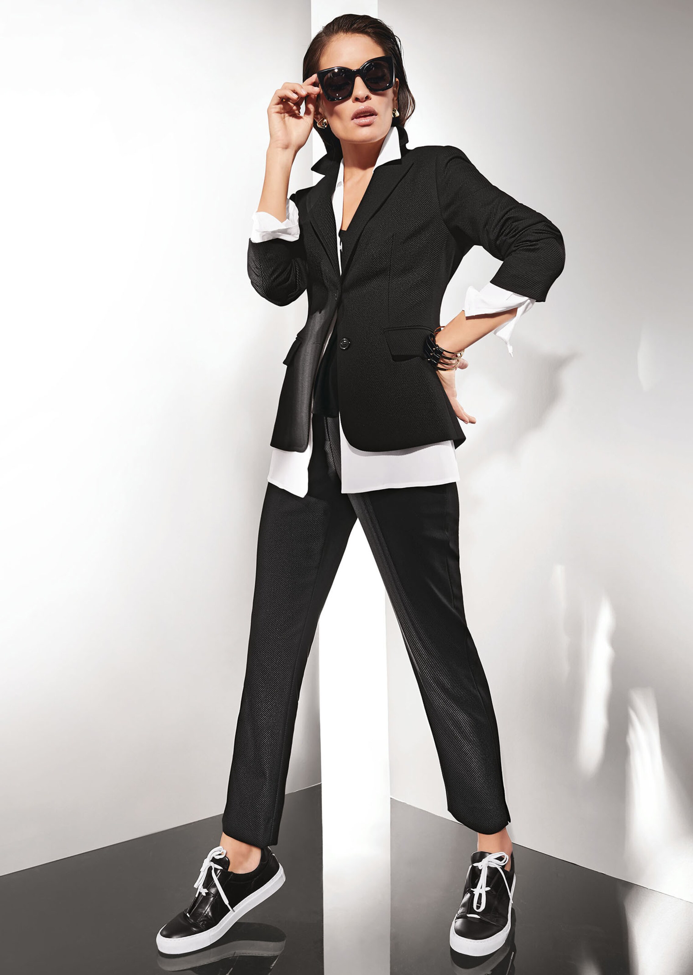 These fashionable trousers are made of comfortable, slightly textured stretch fabric. Finished with a contour waistband with hook fastening, a faux back welt pocket and delicate slits at the hem.