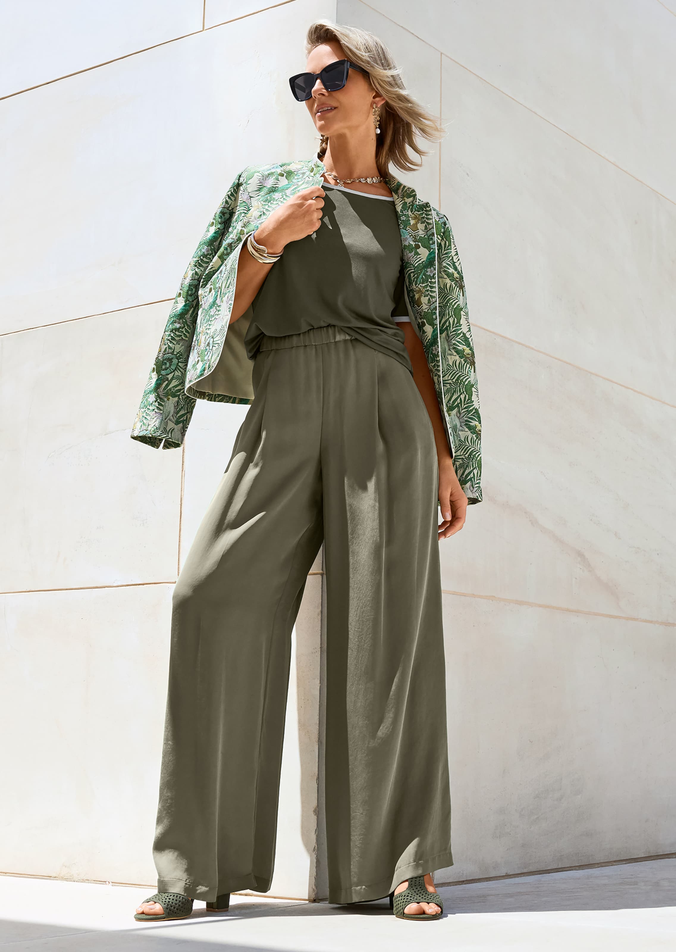 Softly flowing material blend, pleasantly cool against the skin and with an elasticated waistband. Comfortable to slip into with a sweeping leg width and slanted pockets. Fashionable pleats on the front section.