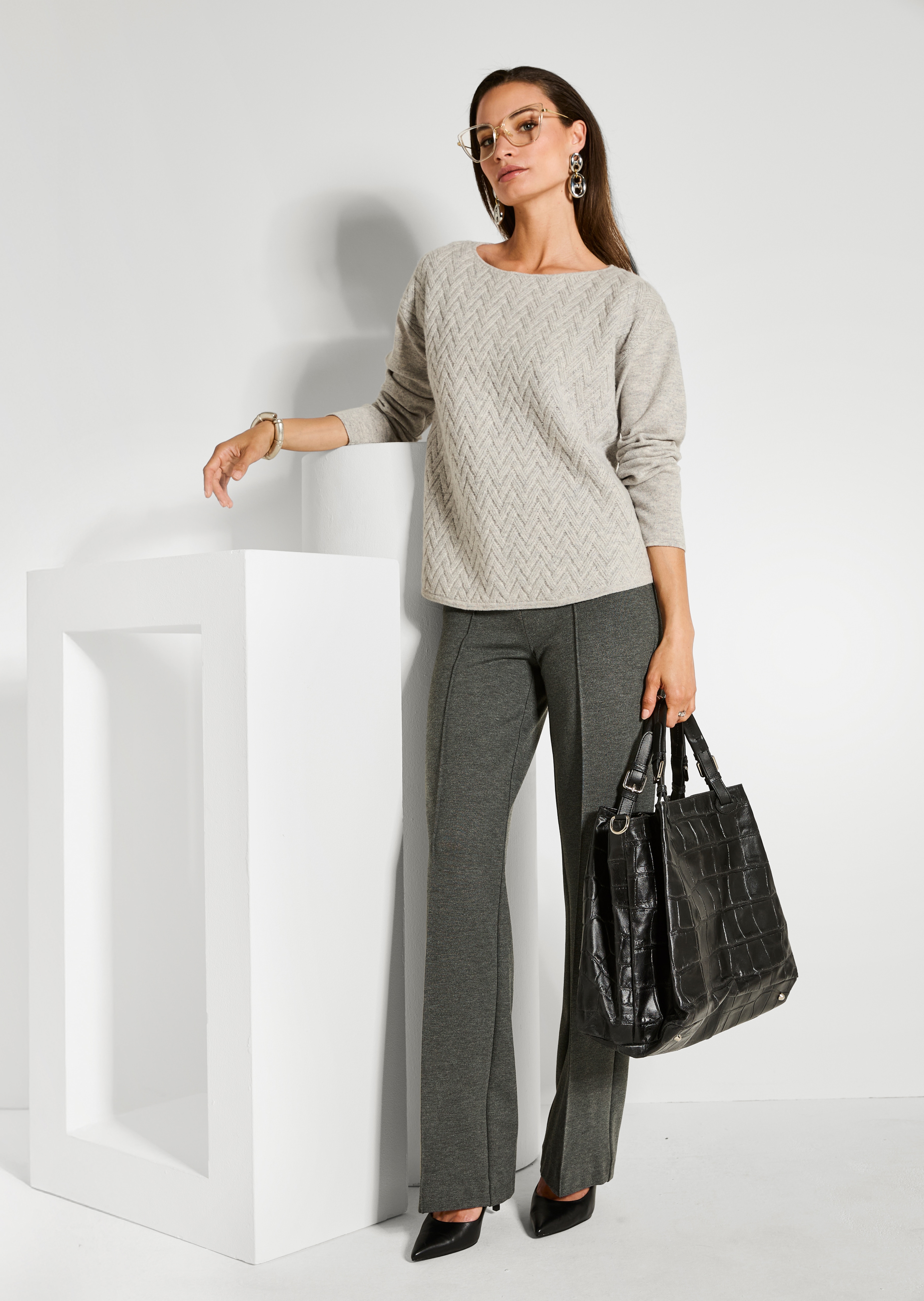 Comfortable jersey fabric in a fashionable, straight, wide shape with vertical piping at the front and a comfortable elasticated waistband. Without bulky pockets.