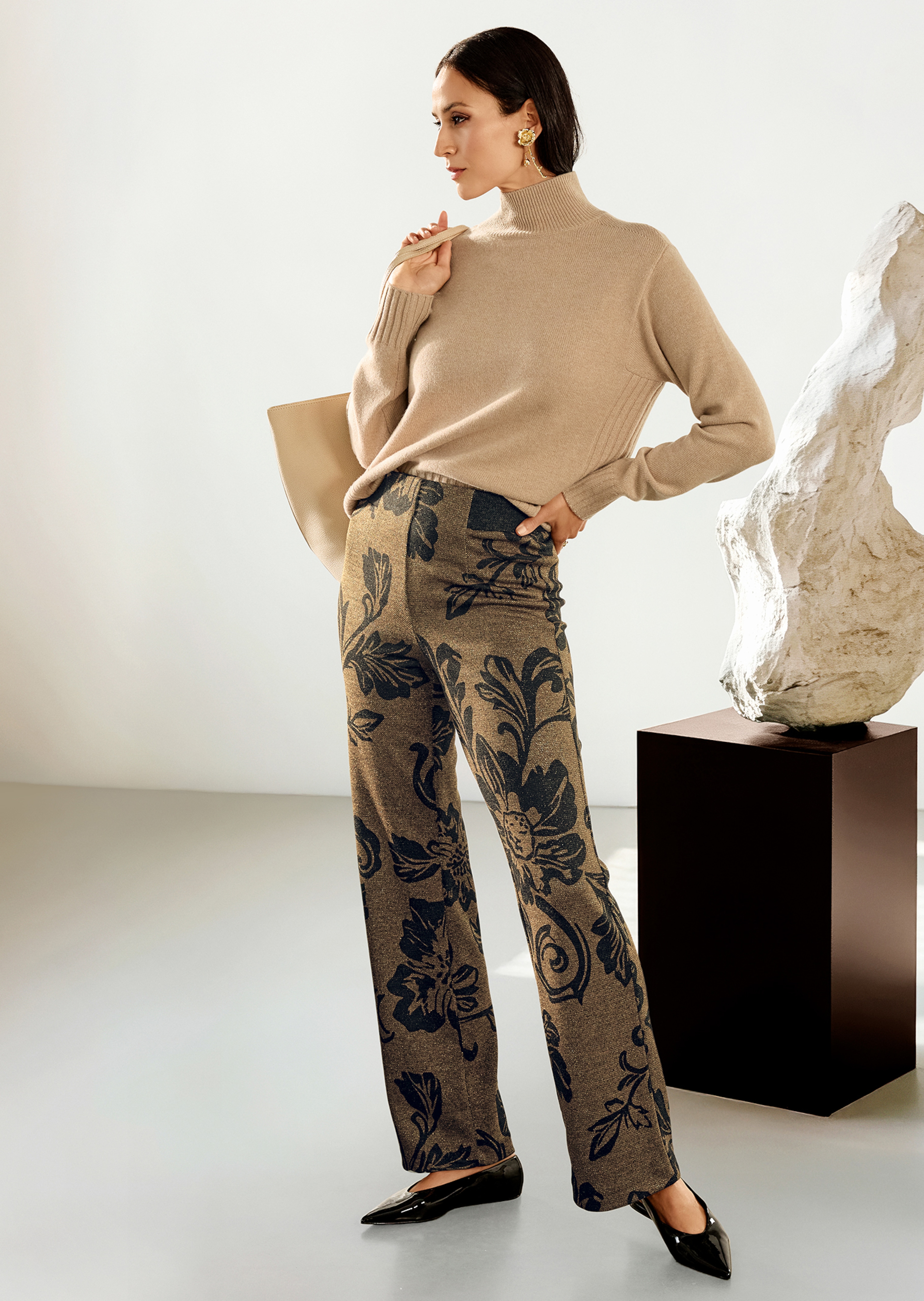 High-quality floral jacquard and shiny novelty yarns make these trousers a fashion highlight. Comfortable stretch fabric with a wide, slightly flared leg shape. The elasticated contour waistband is comfortable to slip on.