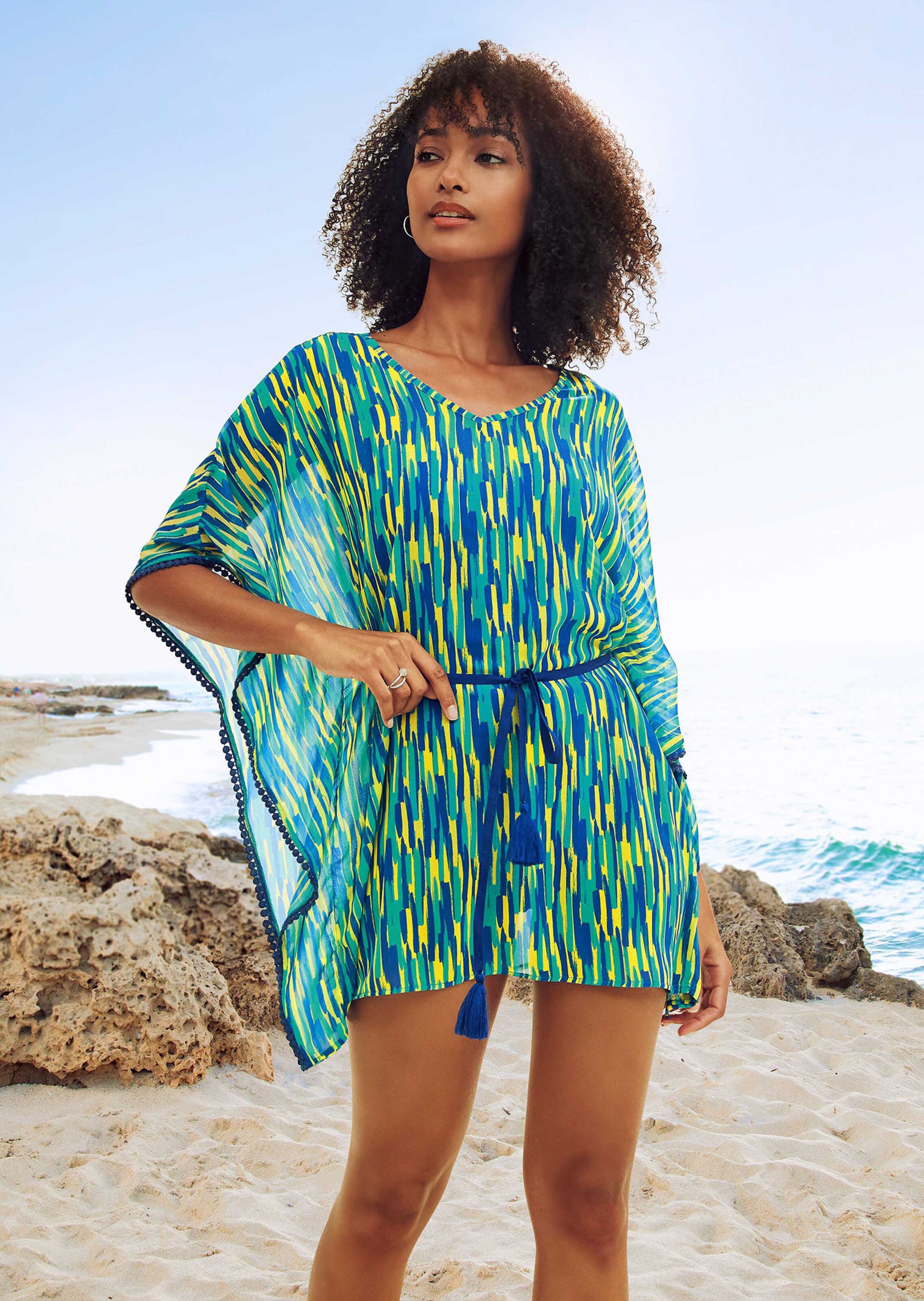 This tunic is produced using recycled materials to conserve precious resources. Slightly sheer, oversized style with V-neckline, adjustable waist cord with tassels, and decorative trim on side edges.