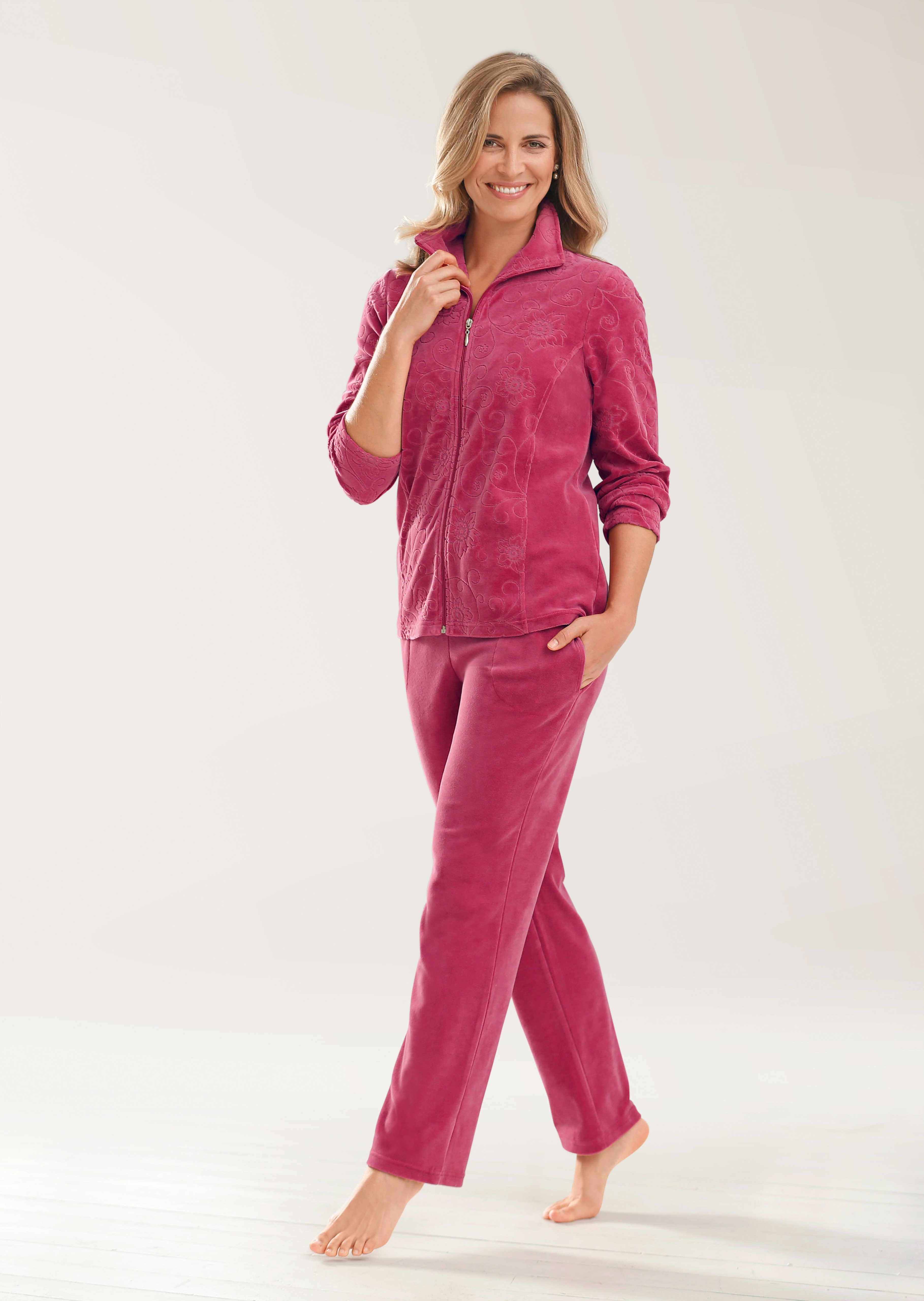 Lounge suit by RINGELLA – made of soft velour with a high cotton content for cosy, feel-good moments. The jacket with a stand-up collar, full-length zip and floral decoration is both fashionable and practical. The straight-tailored trousers with an elasticated waistband and pockets perfectly complete the look. For relaxed hours – whether in the morning, evening or in between.